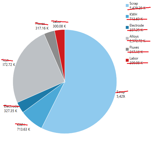 <Window xmlns:telerik="http://schemas.telerik.com/2008/xaml/presentation" x:Class="WpfApplication1.MainWindow" Title="MainWindow" Height="594.024" Width="902.888"> <Grid> <Grid.ColumnDefinitions> <ColumnDefinition Width="*"/> <ColumnDefinition Width="*"/> </Grid.ColumnDefinitions> <telerik:RadPieChart Name="PieChartDemo" HorizontalAlignment="Left" Margin="10,10,0,0" VerticalAlignment="Top" Height="543" Width="428"/> <telerik:RadLegend x:Name="PieLegend" Grid.Column="1" Items="{Binding LegendItems, ElementName=PieChartDemo}"/> </Grid></Window>public MainWindow() { InitializeComponent(); FillPieChart(); } void FillPieChart() { DataTable dtData = new DataTable("DATA"); dtData.Columns.Add(new DataColumn("Name", typeof(string))); dtData.Columns.Add(new DataColumn("Value", typeof(double))); dtData.Rows.Add(new object[] { "Scrap", 5429287.5 }); dtData.Rows.Add(new object[] { "KWH", 713631 }); dtData.Rows.Add(new object[] { "Electrode", 327349 }); dtData.Rows.Add(new object[] { "Alloys", 2372722.3 }); dtData.Rows.Add(new object[] { "Fluxes", 317157.65 }); dtData.Rows.Add(new object[] { "Labor", 300084.1 }); PieChartDemo.Palette = ChartPalettes.Arctic; PieSeries pieSer = new PieSeries(); pieSer.ShowLabels = true; foreach (DataRow drCost in dtData.Rows) { pieSer.DataPoints.Add(new PieDataPoint() { Value = double.Parse(drCost["Value"].ToString()), Label = string.Format("{0}\n{1:N} K", drCost["Name"].ToString(), double.Parse(drCost["Value"].ToString()) / 1000.00) } ); } pieSer.LabelDefinitions.Add(new ChartSeriesLabelDefinition() { Margin = new Thickness(-5, 0, 0, 0) }); pieSer.AngleRange = new AngleRange(270, 360); pieSer.LegendSettings = new DataPointLegendSettings(); PieChartDemo.Series.Clear(); PieChartDemo.Series.Add(pieSer); }I am creating a PieSeries and adding some PieDataPoint. For each data point I add the value and the label, and I think the RadLegend takes this label to show its items. Am I correct?