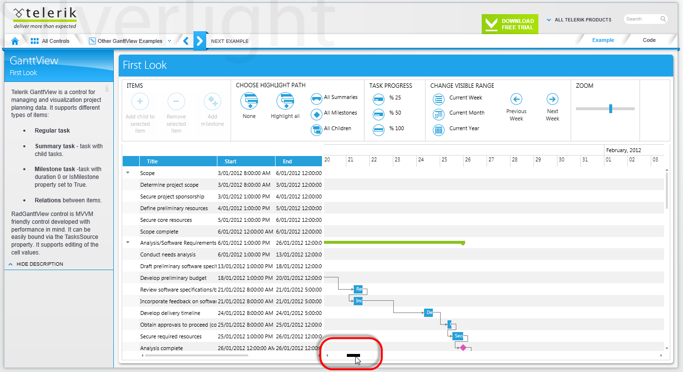 If you go to your telerik example solution (located in your C:\Program Files (x86)\Telerik\RadControls for Silverlight Q1 2012 SP1\Demos ) and open the Solution ExamplesCS_SL.sln in Visual Studio, you can open the example directly by locating Examples > GanntView.Silverlight > FirstLook.xaml in your solution explorer.