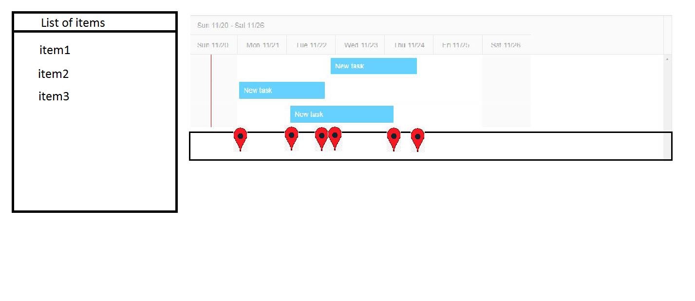 Hi. I want to create something like i showed on screen. Idea is to pick item from "List of items" panel and drop it in Gantt. Additional thing is to connect that panel below to Gantt to be able to display for example pins in the start and end of each component like showed on screen. My question is how to perform this in the best way and which kendo components I could use. Thanks