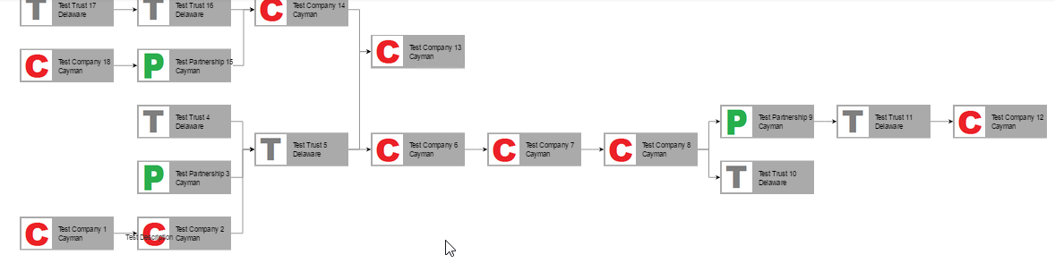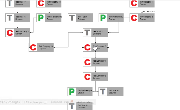 Thanks for the files. I reproduced the problems from the image. The problem with the connection from "Test Company 2" to "Test Trust 5" occurs because the of the order in which the shapes are layouted. You can avoid it by refreshing the connections after the diagram is bound: