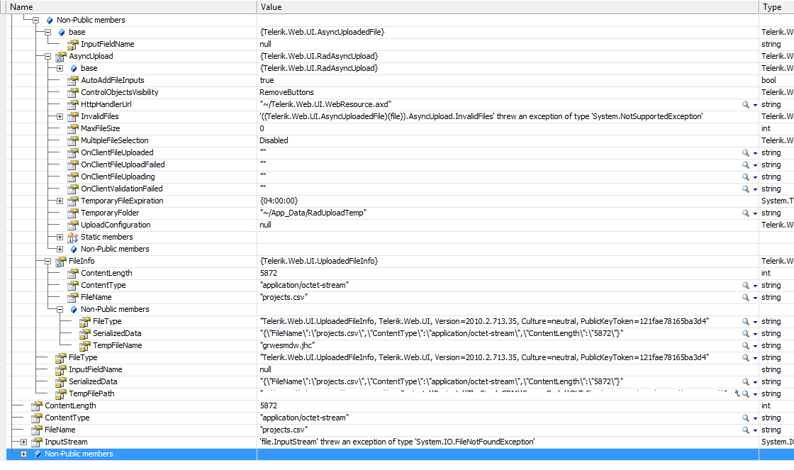It's always coming up with "application/octet-stream". I've attached a screen print of the quick watch window so you can see what in the UploadFile class. The file I uploaded is a csv file and I am using IE8.