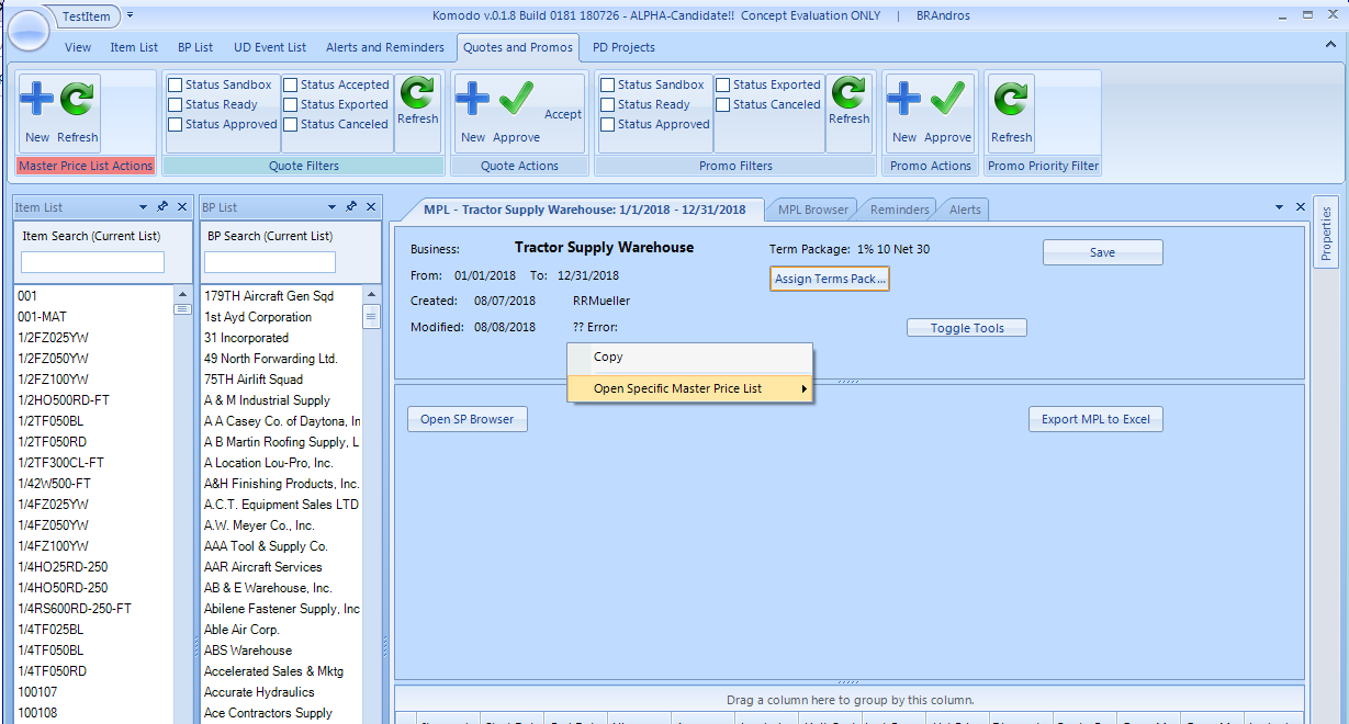 private void MPLList_GridView_ContextMenuOpening(object sender, ContextMenuOpeningEventArgs e) { List<BPPriceMstr> myBP = new List<BPPriceMstr>(); FactoryOrder bpOrder = new FactoryOrder(); int index = MPLList_GridView.Rows.IndexOf(MPLList_GridView.CurrentRow); bpOrder.AddOrderLine("CardCode", masterPriceLists[index].Business.CardCode); BPPriceMstrFactory bpFactory = new BPPriceMstrFactory(); tmpDDL_MPLLists = bpFactory.BuildPriceMstr(bpOrder); ///////////////////////////// //new code -- RRM and BRA ///////////////////////////// //create empty drop down list RadDropDownList mplDropDownList = new RadDropDownList(); mplDropDownList.Text = "Select MPL"; //iterate over all MPLs and add them to the drop down list foreach (BPPriceMstr mpl in tmpDDL_MPLLists) { mplDropDownList.Items.Add(new RadListDataItem(mpl.StartDate.ToShortDateString() + " - " + mpl.EndDate.ToShortDateString())); } //add selected index changed event handler mplDropDownList.SelectedIndexChanged += mplDropDownList_SelectedIndexChanged; //create content item for drop down list RadMenuContentItem contentItem = new RadMenuContentItem(); RadHostItem host = new RadHostItem(mplDropDownList); //populate the drop down list contentItem.ContentElement = host; //set the size of the MPL drop down menu contentItem.AutoSize = false; contentItem.Size = new System.Drawing.Size(150, 100); //here we add an arrow to select MPL from the drop down list. //if only one MPL, there will be only one to choose from RadMenuItem mplSpecific = new RadMenuItem(); mplSpecific.Text = "Open Specific Master Price List"; mplSpecific.Items.Add(contentItem); RadMenuSeparatorItem separator = new RadMenuSeparatorItem(); e.ContextMenu.Items.Add(separator); e.ContextMenu.Items.Add(mplSpecific); }