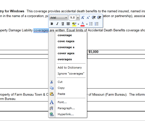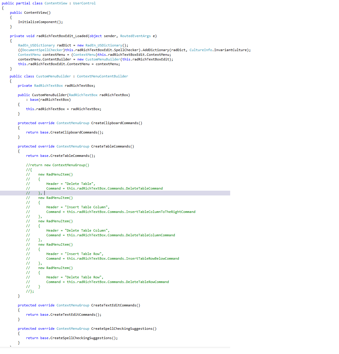 private void radRichTextBoxEdit_Loaded(object sender, RoutedEventArgs e) { RadEn_USDictionary radDict = new RadEn_USDictionary(); ((DocumentSpellChecker)this.radRichTextBoxEdit.SpellChecker).AddDictionary(radDict, CultureInfo.InvariantCulture); ContextMenu contextMenu = (ContextMenu)this.radRichTextBoxEdit.ContextMenu; contextMenu.Showing += new System.EventHandler<ContextMenuEventArgs>(contextMenu_Showing); } private void contextMenu_Showing(object sender, ContextMenuEventArgs e) { e.ContextMenuGroupCollection.Add(CreateCustomMenuGroup()); } private ContextMenuGroup CreateCustomMenuGroup() { RadMenuItem item = new RadMenuItem(); item.Header = "Insert Table"; item.Command = this.radRichTextBoxEdit.Commands.InsertTableCommand; ContextMenuGroup group = new ContextMenuGroup(); group.Add(item); return group; }The InsertTableCommand is not executed, because it requires a parameter indicating the number of rows and columns you want to have in the table. If you want to insert a table that has 3 rows and 2 columns for example, you need to set the CommandParameter property of the item like this: