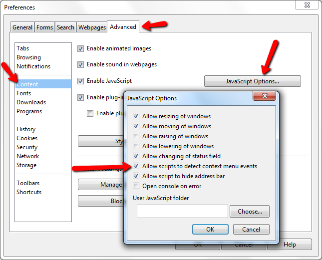Tools -> Preferences -> Advanced -> JavaScript options -> Allow script to receive right clicks