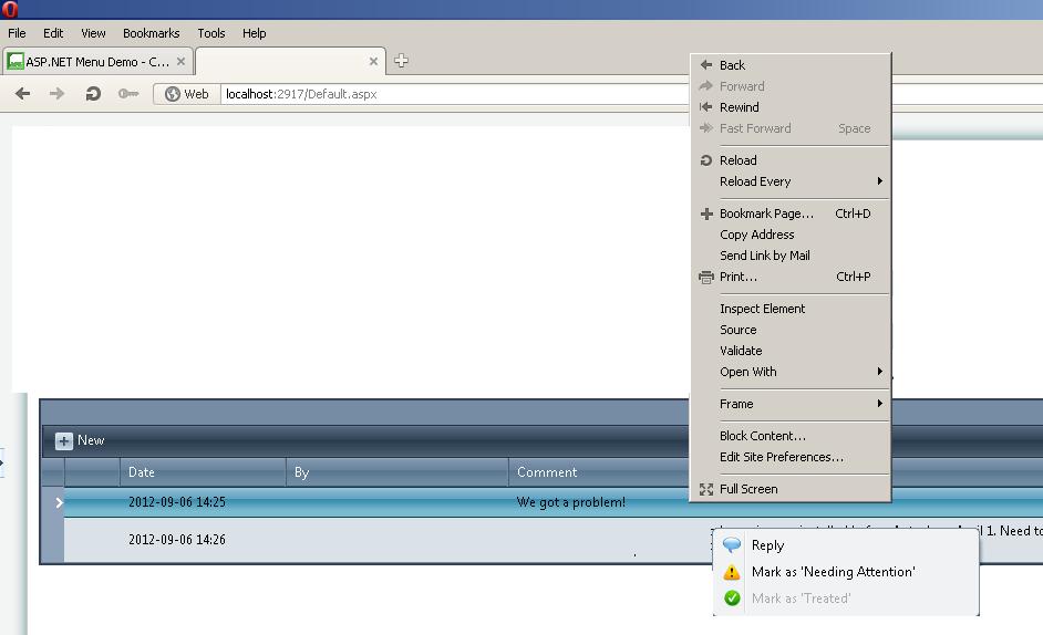 var gblID = 0;function RowContextMenu(sender, eventArgs) { var menu = $find("<%=RadGrid5_Menu.ClientID %>"); var evt = eventArgs.get_domEvent(); if (evt.target.tagName == "INPUT" || evt.target.tagName == "A") { return; } var index = eventArgs.get_itemIndexHierarchical(); var ID; //select row if (eventArgs.get_tableView().get_name() == "Detail") { index = index.substring(index.indexOf("_") + 1, index.length); sender.get_masterTableView().selectItem(eventArgs.get_tableView().get_dataItems()[index].get_element(), true); ID = eventArgs.get_tableView().get_dataItems()[index].getDataKeyValue("intID"); } else { sender.get_masterTableView().selectItem(sender.get_masterTableView().get_dataItems()[index].get_element(), true); ID = sender.get_masterTableView().get_dataItems()[index].getDataKeyValue("intID"); } gblID = ID.toString(); var itemAttention; var itemTreated; itemAttention = menu.findItemByValue(2); itemAttention.disable(); itemTreated = menu.findItemByValue(3); itemTreated.disable(); if (eventArgs.get_tableView().get_name() != "Detail") { itemAttention.enable(); } menu.show(evt); evt.cancelBubble = true; evt.returnValue = false; if (evt.stopPropagation) { evt.stopPropagation(); evt.preventDefault(); } }UPDATE: I also tested your context menu demo containing a RadGrid (DEMO) and I dont have the issue at all in my Opera, as illustrated in "screen3.jpg".