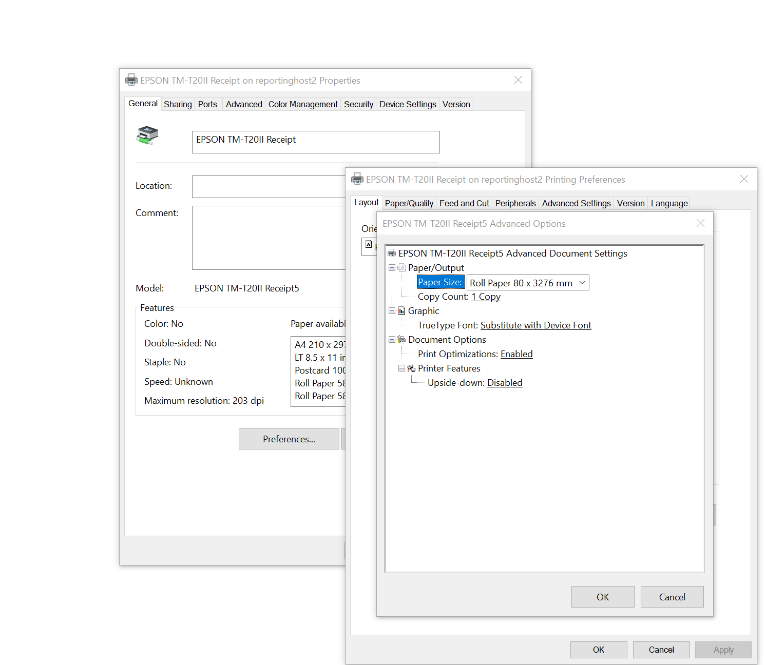 We tested with the default printer setting for paper size: Roll Paper 80 x 297 mm. The print correctly exceeds that size when the report is longer. Then we switched the printer default (or windows) setting to Roll Paper 80 x 3276 mm and got the same result without making any setup on the current print job (see the second attachment).
