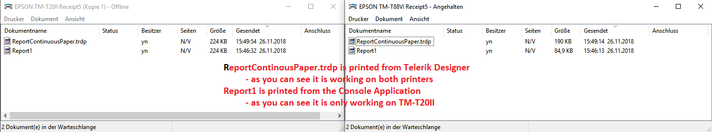 I feel tempted to just tell you that this seems to be an Epson issue since one of the printers is working. From the other side the ReportDesigner prints correctly on both printers, so it seems there is something we should be able to do to influence this.