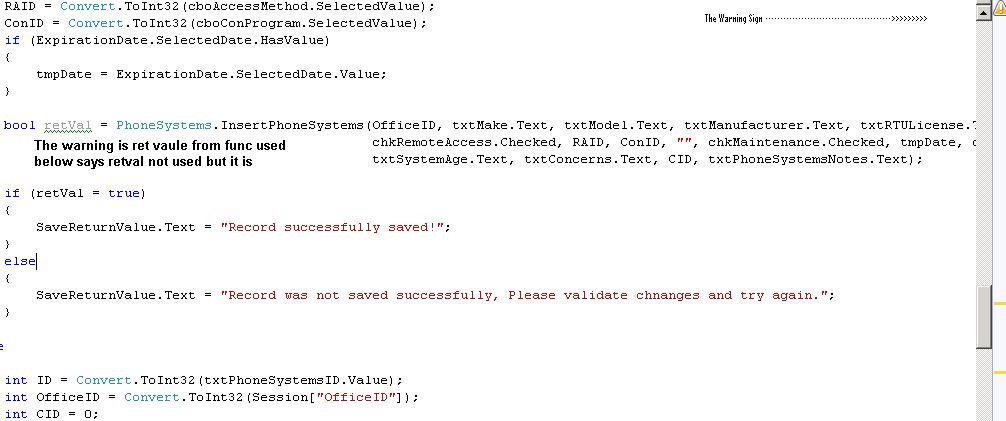 As for your other problem, you are right to complain for this warning. What JustCode is trying to say here is that your variable is only assigned a value and its value is never used. Obviously that is not the case with your example - you assign a value to it and at the same time have it in an "if" clause. Although this is a legal syntax I'm guessing what you really wanted to write is - if (retValue == true) and not if (retValue = true).