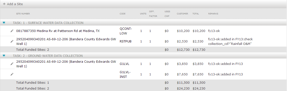<telerik:RadGrid ID="rgSite" runat="server" AllowSorting="True" Skin="Silk" OnNeedDataSource="rgSite_NeedDataSource" EnableLinqExpressions="false" OnPreRender="rgSite_PreRender" AutoGenerateColumns="False" AlternatingItemStyle-BackColor="White" Width="1298px" OnUpdateCommand="rgSite_UpdateCommand" OnInsertCommand="rgSite_InsertCommand"> <MasterTableView CommandItemDisplay="Top" ShowFooter="true" ShowGroupFooter="true" DataKeyNames="details_site_id"> <EditFormSettings PopUpSettings-Modal="false" UserControlName="controls/FundedSites.ascx" EditFormType="WebUserControl"/> <CommandItemSettings ShowRefreshButton="false" ShowAddNewRecordButton="false" addnewrecordtext="Add a Site"/> <Columns> <telerik:GridEditCommandColumn ButtonType="ImageButton" Visible="false" UniqueName="Edit"/> <telerik:GridBoundColumn DataField="site_no" SortExpression="site_no" AllowSorting="true" UniqueName="site_no" visible="false"/> <telerik:GridTemplateColumn DataField="site_no_nm" SortExpression="site_no_nm" UniqueName="site_no_nm" HeaderText="Site Number" ItemStyle-BorderStyle="Solid" ItemStyle-Bordercolor="Silver" ItemStyle-BorderWidth="0.25" Aggregate="CountDistinct" FooterText="Total Funded Sites: "> <ItemTemplate> <asp:HyperLink ID="HyperLink1" runat="server" NavigateUrl='<%# string.Format("site.aspx?org_cd={0}&cust_id={1}&agmt_id={2}&site_no={3}",org_cd,cust_id,agmt_id,ProcessMyDataItem(Eval("site_no"))) %>' Text='<%# ProcessMyDataItem(Eval("site_no_nm")) %>'/> <asp:HiddenField runat="server" ID="hfCollectionUnits" Visible="false" Value='<%# ProcessMyDataItem(Eval("data_collection")) %>'/> </ItemTemplate> </telerik:GridTemplateColumn> <telerik:GridTemplateColumn DataField="collection_cd" SortExpression="collection_cd" UniqueName="collection_cd" HeaderText="Code" ItemStyle-BorderStyle="Solid" ItemStyle-Bordercolor="Silver" ItemStyle-BorderWidth="0.25"> <ItemTemplate> <a title='<%# ProcessMyDataItem(Eval("collection_desc")) %>' style="color:Black;text-decoration:none;"> <%# ProcessMyDataItem(Eval("collection_cd"))%> </a> </ItemTemplate> </telerik:GridTemplateColumn> <telerik:GridBoundColumn DataField="collection_units" SortExpression="collection_units" AllowSorting="true" UniqueName="collection_units" HeaderText="Units" ItemStyle-BorderStyle="Solid" ItemStyle-Bordercolor="Silver" ItemStyle-BorderWidth="0.25" ColumnEditorID="ceUnit"/> <telerik:GridBoundColumn DataField="diff_factor" SortExpression="diff_factor" AllowSorting="true" UniqueName="diff_factor" HeaderText="Diff. Factor" ItemStyle-BorderStyle="Solid" ItemStyle-Bordercolor="Silver" ItemStyle-BorderWidth="0.25" ColumnEditorID="ceUnit"/> <%--<telerik:GridBoundColumn DataField="data_collection" SortExpression="data_collection" UniqueName="data_collection" HeaderText="Data Collection" Visible="false" ItemStyle-BorderStyle="Solid" ItemStyle-Bordercolor="Silver" ItemStyle-BorderWidth="0.25" />--%> <telerik:GridNumericColumn DataField="funding_usgs_cwp" SortExpression="funding_usgs_cwp" AllowSorting="true" UniqueName="funding_usgs_cwp" HeaderText="USGS CWP" DataFormatString="{0:c0}" DataType="System.Decimal" ItemStyle-BorderStyle="Solid" ItemStyle-Bordercolor="Silver" ItemStyle-BorderWidth="0.25" Aggregate="Sum" FooterAggregateFormatString="{0:c0}" ColumnEditorID="ceFunds"/> <telerik:GridNumericColumn DataField="funding_customer" SortExpression="funding_customer" AllowSorting="true" UniqueName="funding_customer" HeaderText="Customer" DataFormatString="{0:c0}" DataType="System.Decimal" ItemStyle-BorderStyle="Solid" ItemStyle-Bordercolor="Silver" ItemStyle-BorderWidth="0.25" Aggregate="Sum" FooterAggregateFormatString="{0:c0}" ColumnEditorID="ceFunds"/> <telerik:GridBoundColumn DataField="funding_total" SortExpression="funding_total" AllowSorting="true" UniqueName="total" HeaderText="Total" DataFormatString="{0:c0}" DataType="System.Decimal" ItemStyle-BorderStyle="Solid" ItemStyle-Bordercolor="Silver" ItemStyle-BorderWidth="0.25" Aggregate="Sum" FooterAggregateFormatString="{0:c0}" ReadOnly="true"/> <telerik:GridBoundColumn DataField="remarks" SortExpression="remarks" AllowSorting="true" UniqueName="remarks" HeaderText="Remarks" ItemStyle-BorderStyle="Solid" ItemStyle-Bordercolor="Silver" ItemStyle-BorderWidth="0.25" /> <telerik:GridButtonColumn ConfirmText="Delete this record?" ConfirmDialogType="RadWindow" confirmtitle="Delete" ButtonType="ImageButton" CommandName="Delete" Text="Delete" uniquename="Delete" Visible="false"/> </Columns> <GroupByExpressions> <telerik:GridGroupByExpression> <SelectFields> <telerik:GridGroupByField FieldName="data_collection" FieldAlias="Task"/> </SelectFields> <GroupByFields> <telerik:GridGroupByField FieldName="data_collection" /> </GroupByFields> </telerik:GridGroupByExpression> </GroupByExpressions> <ExpandCollapseColumn>