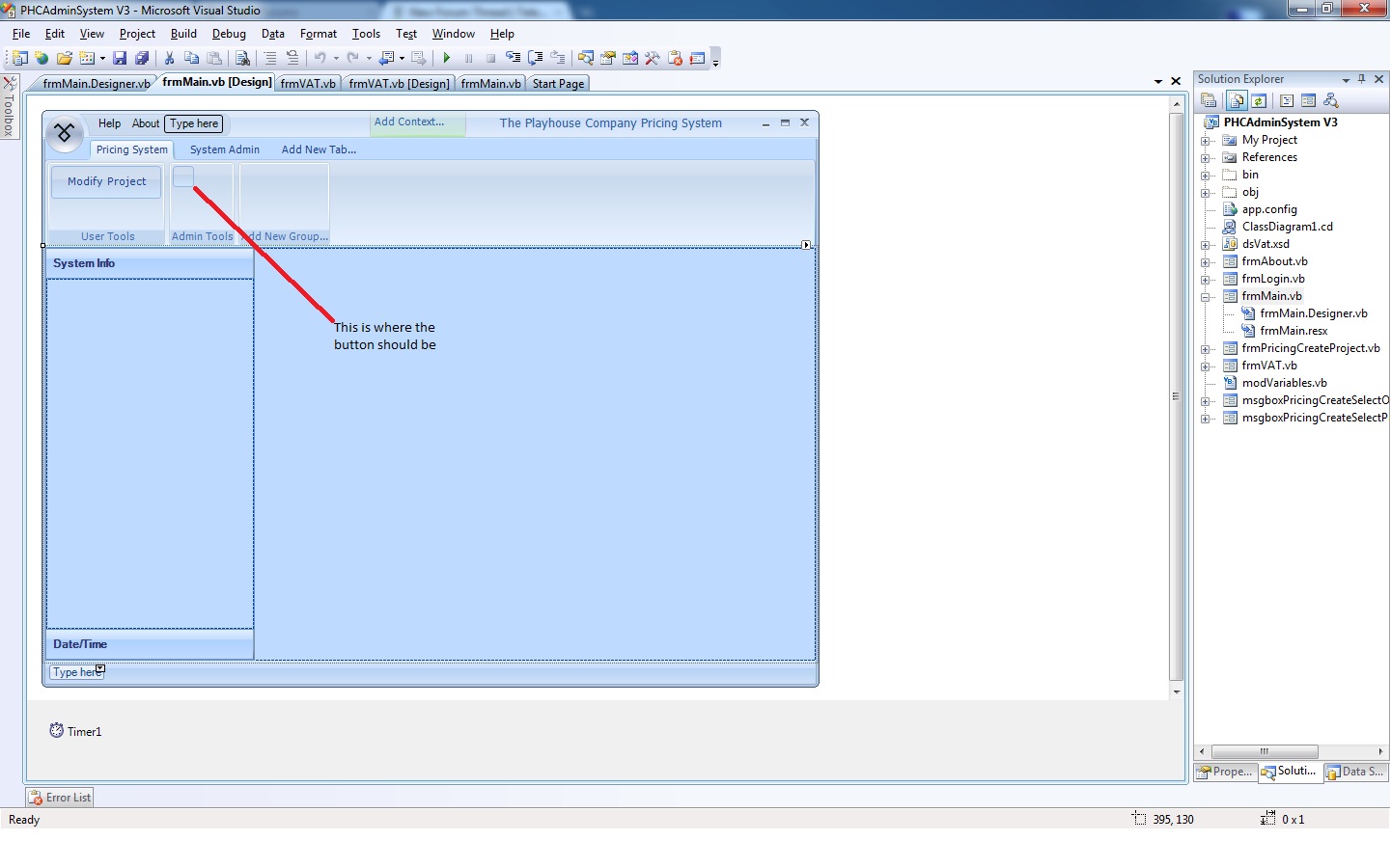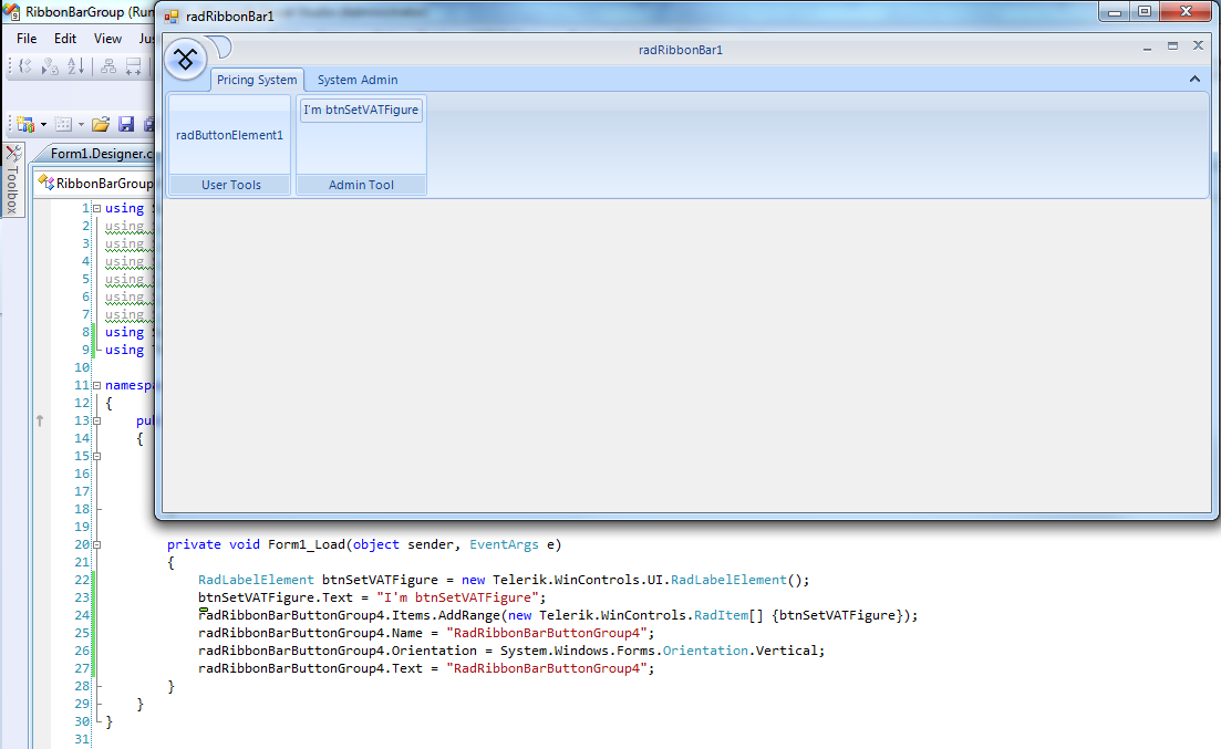Me.btnSetVATFigure = New Telerik.WinControls.UI.RadLabelElement' 'RadRibbonBarButtonGroup4 ' Me.RadRibbonBarButtonGroup4.Items.AddRange(New Telerik.WinControls.RadItem() {Me.RadButtonElement18, Me.btnRemoveProject, Me.RadButtonElement17, Me.btnPricingRemoveProject, Me.btnPricingEditPrices, Me.RadButtonElement20, Me.btnSetVATFigure}) Me.RadRibbonBarButtonGroup4.Name = "RadRibbonBarButtonGroup4" Me.RadRibbonBarButtonGroup4.Orientation = System.Windows.Forms.Orientation.Vertical Me.RadRibbonBarButtonGroup4.Text = "RadRibbonBarButtonGroup4"However as you can see from the attached screen shot the button is not visible on the form.