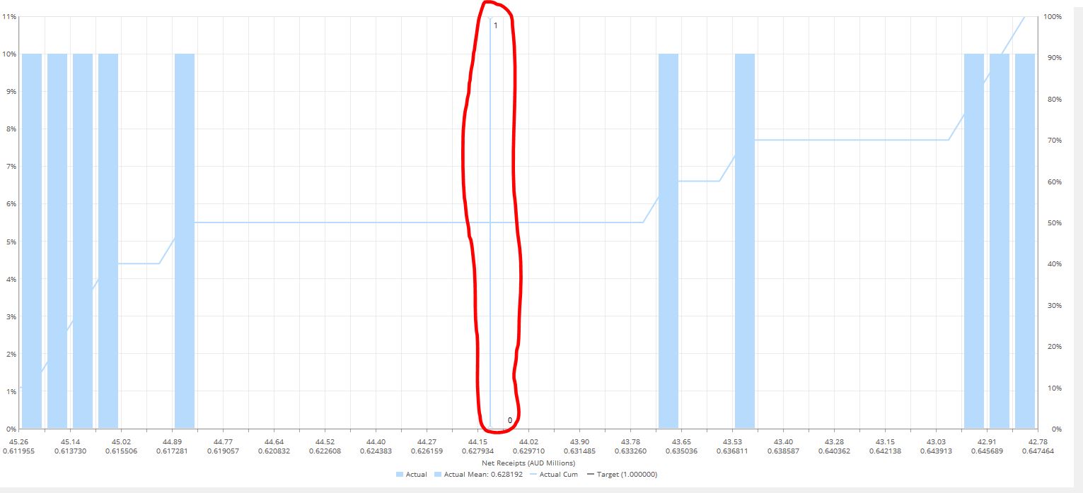 It has this middle vertical line (which is the Actual Mean series/legend) that I am very confuse how to convert to KendoUI. Underneath, it has 2 data point value 0 and 1. The Axis is assign to the right axis. Another question is how it is placed in the middle of the chart with only 2 data points? There is no programmatic manipulation seen on the old code.