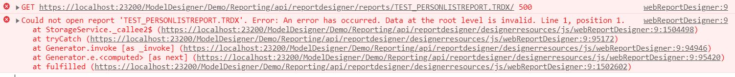 Could not open report 'TEST_PERSONLISTREPORT.TRDX'. Error: An error has occurred. Data at the root level is invalid. Line 1, position 1.