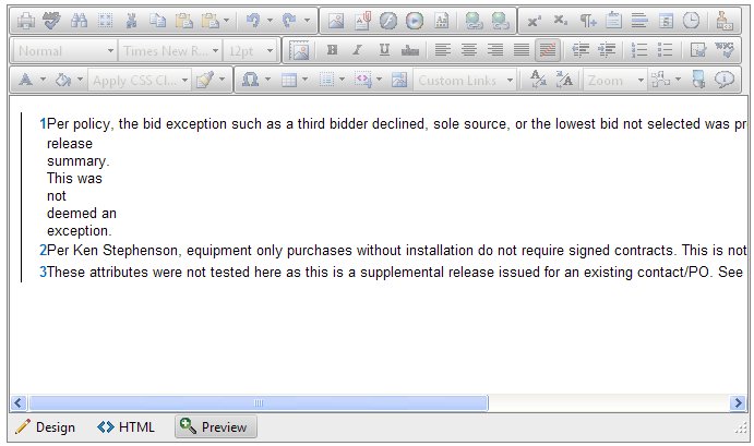<table style="width: 757pt; border-collapse: collapse;" border="0" cellspacing="0" cellpadding="0" width="1008"> <colgroup><col style="width: 18pt;" width="24" /><col style="width: 98pt;" width="131" /><col style="width: 56pt;" width="74" /><col style="width: 73pt;" width="97" /><col style="width: 66pt;" span="2" width="88" /><col style="width: 80pt;" width="106" /><col style="width: 90pt;" width="120" /><col style="width: 49pt;" width="65" /><col style="width: 90pt;" width="120" /><col style="width: 71pt;" width="95" /></colgroup> <tbody> <tr style="height: 15pt;" height="20"> <td style="border-bottom-color: #ece9d8; border-left: windowtext 1pt solid; background-color: transparent; border-top-color: #ece9d8; width: 18pt; height: 15pt; border-right-color: #ece9d8;" class="xl66" align="right"><strong><span style="font-family: arial; color: #0070c0; font-size: 13px;">1</span></strong></td> <td style="background-color: transparent; width: 668pt;border-color: #ece9d8;" class="xl67" colspan="9"><span style="font-family: arial; font-size: 13px;">Per policy, the bid exception such as a third bidder declined, sole source, or the lowest bid not selected was properly documented within the project</span></td> <td style="background-color: transparent; width: 71pt;border-color: #ece9d8;"></td> </tr> <tr style="height: 15pt;" height="20"> <td style="border-bottom-color: #ece9d8; border-left: windowtext 1pt solid; background-color: transparent; border-top-color: #ece9d8; height: 15pt; border-right-color: #ece9d8;" class="xl66"><strong><span style="font-family: arial; color: #0070c0; font-size: 13px;"> </span></strong></td> <td style="background-color: transparent;border-color: #ece9d8;" class="xl67" colspan="4"><span style="font-family: arial; font-size: 13px;">release summary. This was not deemed an exception. </span></td> <td style="background-color: transparent;border-color: #ece9d8;"></td> <td style="background-color: transparent;border-color: #ece9d8;"></td> <td style="background-color: transparent;border-color: #ece9d8;"></td> <td style="background-color: transparent;border-color: #ece9d8;"></td> <td style="background-color: transparent;border-color: #ece9d8;"></td> <td style="background-color: transparent;border-color: #ece9d8;"></td> </tr> <tr style="height: 15pt;" height="20"> <td style="border-bottom-color: #ece9d8; border-left: windowtext 1pt solid; background-color: transparent; border-top-color: #ece9d8; height: 15pt; border-right-color: #ece9d8;" class="xl66" align="right"><strong><span style="font-family: arial; color: #0070c0; font-size: 13px;">2</span></strong></td> <td style="background-color: transparent;border-color: #ece9d8;" class="xl68" colspan="9"><span style="font-family: arial; font-size: 13px;">Per Ken Stephenson, equipment only purchases without installation do not require signed contracts. This is not deemed an exception. </span></td> <td style="background-color: transparent;border-color: #ece9d8;"></td> </tr> <tr style="height: 15pt;" height="20"> <td style="border-bottom-color: #ece9d8; border-left: windowtext 1pt solid; background-color: transparent; border-top-color: #ece9d8; height: 15pt; border-right-color: #ece9d8;" class="xl66" align="right"><strong><span style="font-family: arial; color: #0070c0; font-size: 13px;">3</span></strong></td> <td style="background-color: transparent;border-color: #ece9d8;" class="xl68" colspan="10"><span style="font-family: arial; font-size: 13px;">These attributes were not tested here as this is a supplemental release issued for an existing contact/PO. See testing of the initial releases #25013 and #25117.</span></td> </tr> </tbody> </table>Hi,