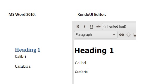 These editors are able to insert the headline correctly and also the Calibri-font is correctly inserted. And this is what I exactly need the Kendo-Editor to do.