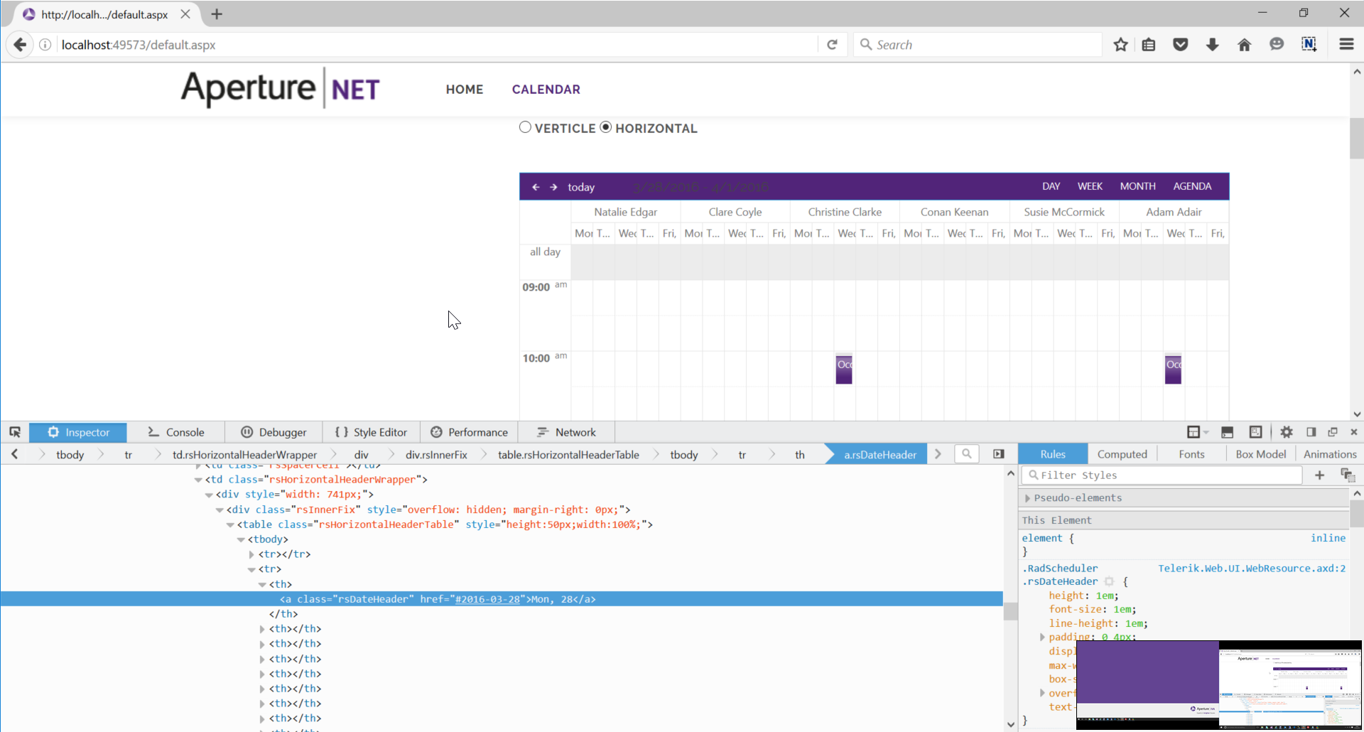 01.<legend><i class="fa fa-angle-right"></i>Available Appointments</legend>02. <asp:UpdatePanel ID="UpdatePanel1" runat="server">03. <ContentTemplate>04. <div>05. <legend>Calendar Layout</legend>06. <asp:RadioButtonList ID="rbDisplay" CellSpacing="5" AutoPostBack="true" RepeatDirection="Horizontal" runat="server">07. <asp:ListItem Value="1"> Verticle </asp:ListItem>08. <asp:ListItem Value="2"> Horizontal </asp:ListItem>09. </asp:RadioButtonList>10. </div>11. <telerik:RadScheduler OnTimeSlotCreated="apertureAppointments_TimeSlotCreated" OverflowBehavior="Auto" runat="server" WeekView-ShowDateHeaders="true" ID="apertureAppointments"12. TimelineView-UserSelectable="false" DayView-UserSelectable="true" AgendaView-UserSelectable="True" DataKeyField="ID" DataSubjectField="Subject" AllowInsert="false" AllowDelete="false" AllowEdit="false"13. DataStartField="Start" DataEndField="End" DataRecurrenceField="RecurrenceRule" DayView-EnableExactTimeRendering="true" WeekView-UserSelectable="True" SelectedView="WeekView"14. DataRecurrenceParentKeyField="RecurrenceParentID" DataSourceID="EntityDataSource1" StartInsertingInAdvancedForm="True" MonthView-UserSelectable="True" AgendaView-NumberOfDays="5" RowHeight="40px"15. RenderMode="Classic" EnableExactTimeRendering="True" Reminders-Enabled="true" Width="800px" Height="1000px" EnableDatePicker="false"16. DayStartTime="09:00:00" ShowFooter="false" DayEndTime="18:00" FirstDayOfWeek="Monday" LastDayOfWeek="Friday" HoursPanelTimeFormat="HH:mm tt" OnAppointmentClick="apertureAppointments_AppointmentClick" OnTimeSlotContextMenuItemClicking="apertureAppointments_TimeSlotContextMenuItemClicking"17. EnableDescriptionField="true" AppointmentStyleMode="Default" Skin="Metro">18. 19. <AdvancedForm Modal="True" />20. 21. <TimeSlotContextMenuSettings EnableDefault="false" />22. <AppointmentContextMenuSettings EnableDefault="false" />23. <DayView EnableExactTimeRendering="True" />24. <AdvancedForm Modal="true"></AdvancedForm>25. 26. <ResourceTypes>27. <telerik:ResourceType KeyField="lookup_code" Name="Managers" TextField="lookup_description" ForeignKeyField="managerId"28. DataSourceID="ManagersDataSource"></telerik:ResourceType>29. </ResourceTypes>30. <ResourceStyles>31. <%--AppointmentStyleMode must be explicitly set to Default (see above) otherwise setting BackColor/BorderColor32. will switch the appointments to Simple rendering (no rounded corners and gradients)--%>33. <telerik:ResourceStyleMapping Type="Managers" Text="Natalie Edgar"34. BackColor="#512479" ApplyCssClass="appointment" />35. <telerik:ResourceStyleMapping Type="Managers" Text="Clare Coyle"36. BackColor="#512479" ApplyCssClass="appointment" />37. <telerik:ResourceStyleMapping Type="Managers" Text="Christine Clarke"38. BackColor="#512479" ApplyCssClass="appointment" />39. <telerik:ResourceStyleMapping Type="Managers" Text="Adam Adair"40. BackColor="#512479" ApplyCssClass="appointment" />41. </ResourceStyles>42. </telerik:RadScheduler>43. </ContentTemplate>44.</asp:UpdatePanel>I just dont no what is wrong that is causing this corruption for when i look at your demos their fine in week view with horzontal grouping ?.