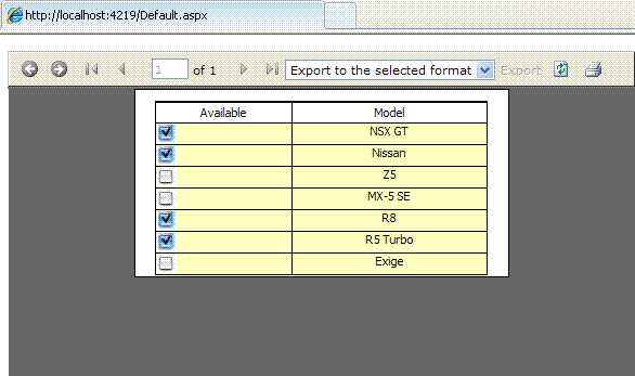 // // cbRequired // this.cbRequired.CheckAlign = System.Drawing.ContentAlignment.MiddleCenter; this.cbRequired.CheckedImage = ((object)(resources.GetObject("cbRequired.CheckedImage"))); this.cbRequired.IndeterminateImage = ((object)(resources.GetObject("cbRequired.IndeterminateImage"))); this.cbRequired.Location = new Telerik.Reporting.Drawing.PointU(new Telerik.Reporting.Drawing.Unit(0.30000001192092896, Telerik.Reporting.Drawing.UnitType.Inch), new Telerik.Reporting.Drawing.Unit(0, Telerik.Reporting.Drawing.UnitType.Inch)); this.cbRequired.Name = "cbRequired"; this.cbRequired.Size = new Telerik.Reporting.Drawing.SizeU(new Telerik.Reporting.Drawing.Unit(0.59999996423721313, Telerik.Reporting.Drawing.UnitType.Inch), new Telerik.Reporting.Drawing.Unit(0.24999998509883881, Telerik.Reporting.Drawing.UnitType.Inch)); this.cbRequired.Style.BorderStyle.Top = Telerik.Reporting.Drawing.BorderType.Solid; this.cbRequired.Style.Padding.Left = new Telerik.Reporting.Drawing.Unit(0, Telerik.Reporting.Drawing.UnitType.Inch); this.cbRequired.Style.TextAlign = Telerik.Reporting.Drawing.HorizontalAlign.Center; this.cbRequired.Style.VerticalAlign = Telerik.Reporting.Drawing.VerticalAlign.Middle; this.cbRequired.StyleName = ""; this.cbRequired.Text = " "; this.cbRequired.UncheckedImage = ((object)(resources.GetObject("cbRequired.UncheckedImage"))); this.cbRequired.Value = "=Fields.Required"; Please let me know what I am doing wrong. Thanks.