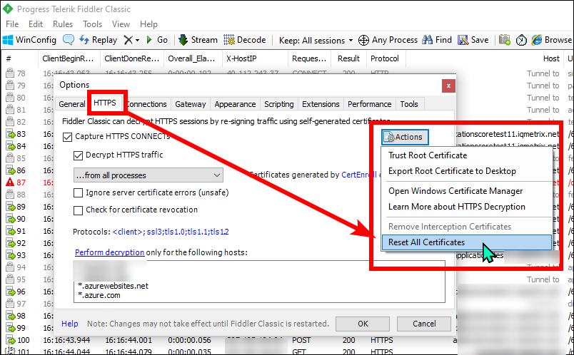 I have Windows 10 and Kaspersky which does not like the certificates/routing provided by Fiddler2.