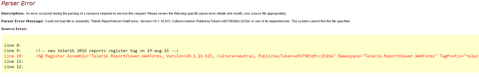 "Could not load file or assembly 'Telerik.ReportViewer.WebForms, Version=10.1.16.615, Culture=neutral, PublicKeyToken=a9d7983dfcc261be' or one of its dependencies. The system cannot find the file specified."