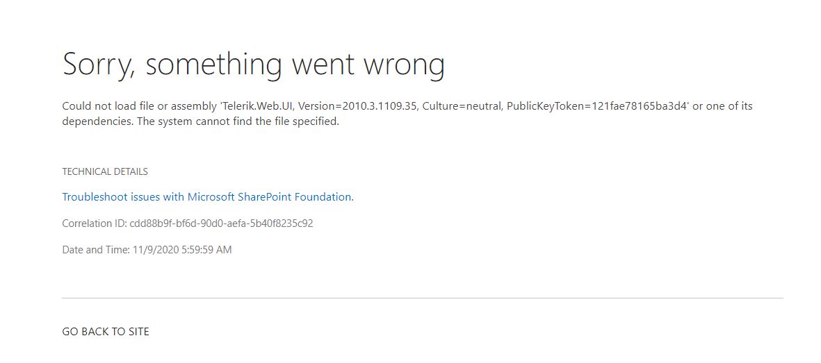 Could not load file or assembly 'Telerik.Web.UI, Version=2010.3.1109.35, Culture=neutral, PublicKeyToken=121fae78165ba3d4' or one of its dependencies. The system cannot find the file specified.