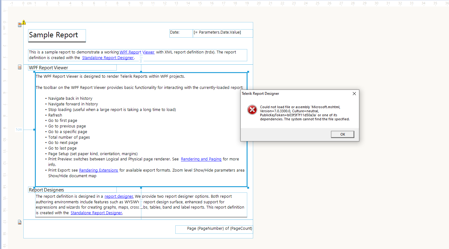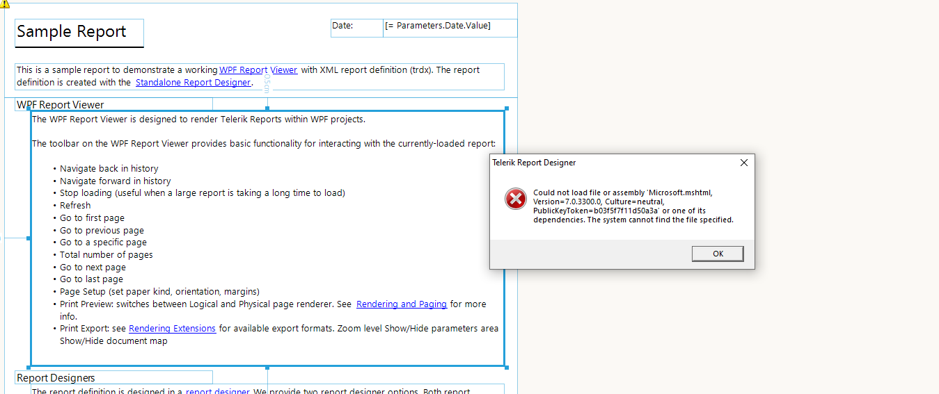 Once the microsoft.mshtml assembly has been added to the GAC, open the SampleReport.trdp and select the HtmlTextBox as before.