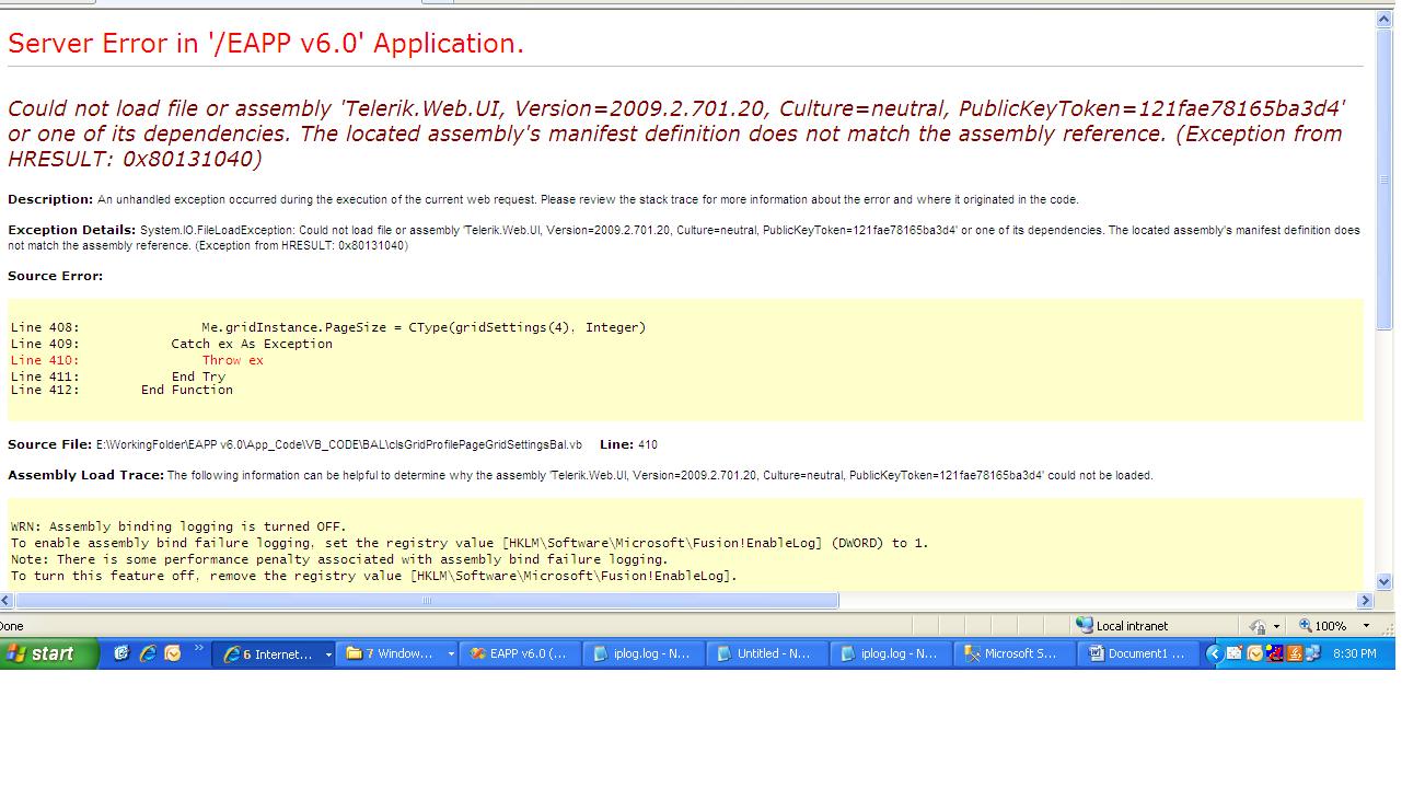 I our project we are using Class GridSettingsPersister in the link(http://www.telerik.com/help/aspnet/grid/grdsavingsettingsonperuserbasis.html). Previously when we are Telerik.Web.UI version 2009.2.701.20 it was working fine. We upgrade Telerik.Web.UI version ()it is crashing in some page at Dim gridSettings() As Object = CType(formatter.Deserialize(reader), Object()).