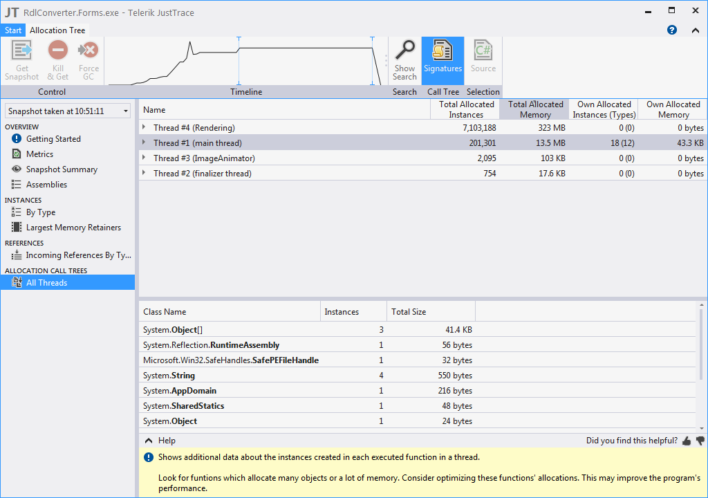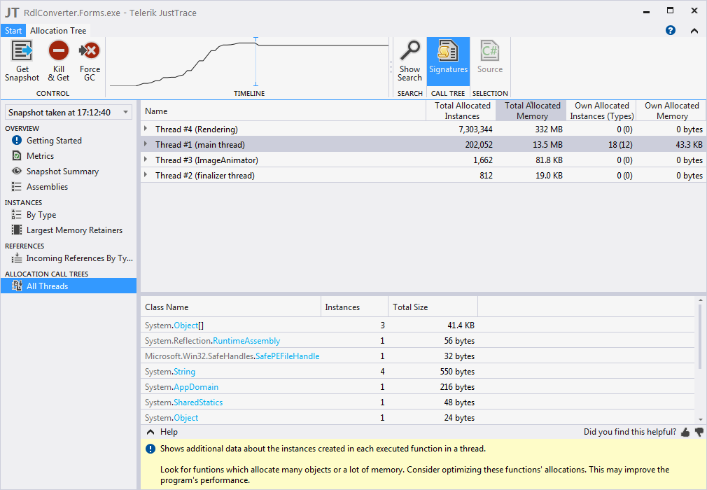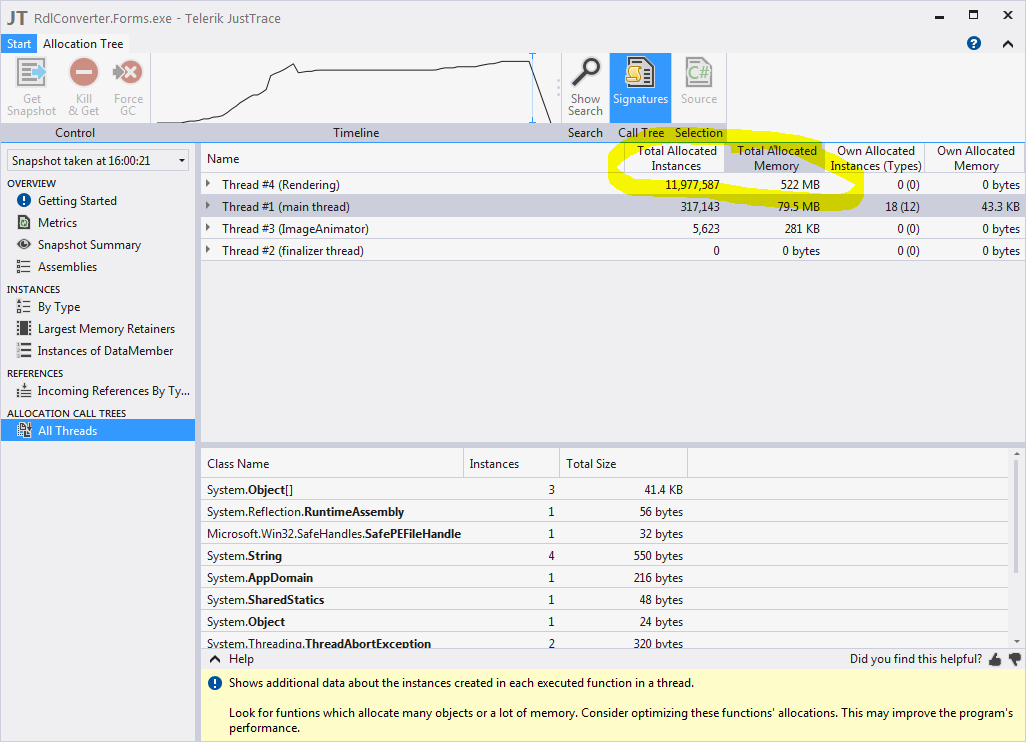 With this I was able to shave the processing memory from the rendering thread from 450mb down to 380mb.