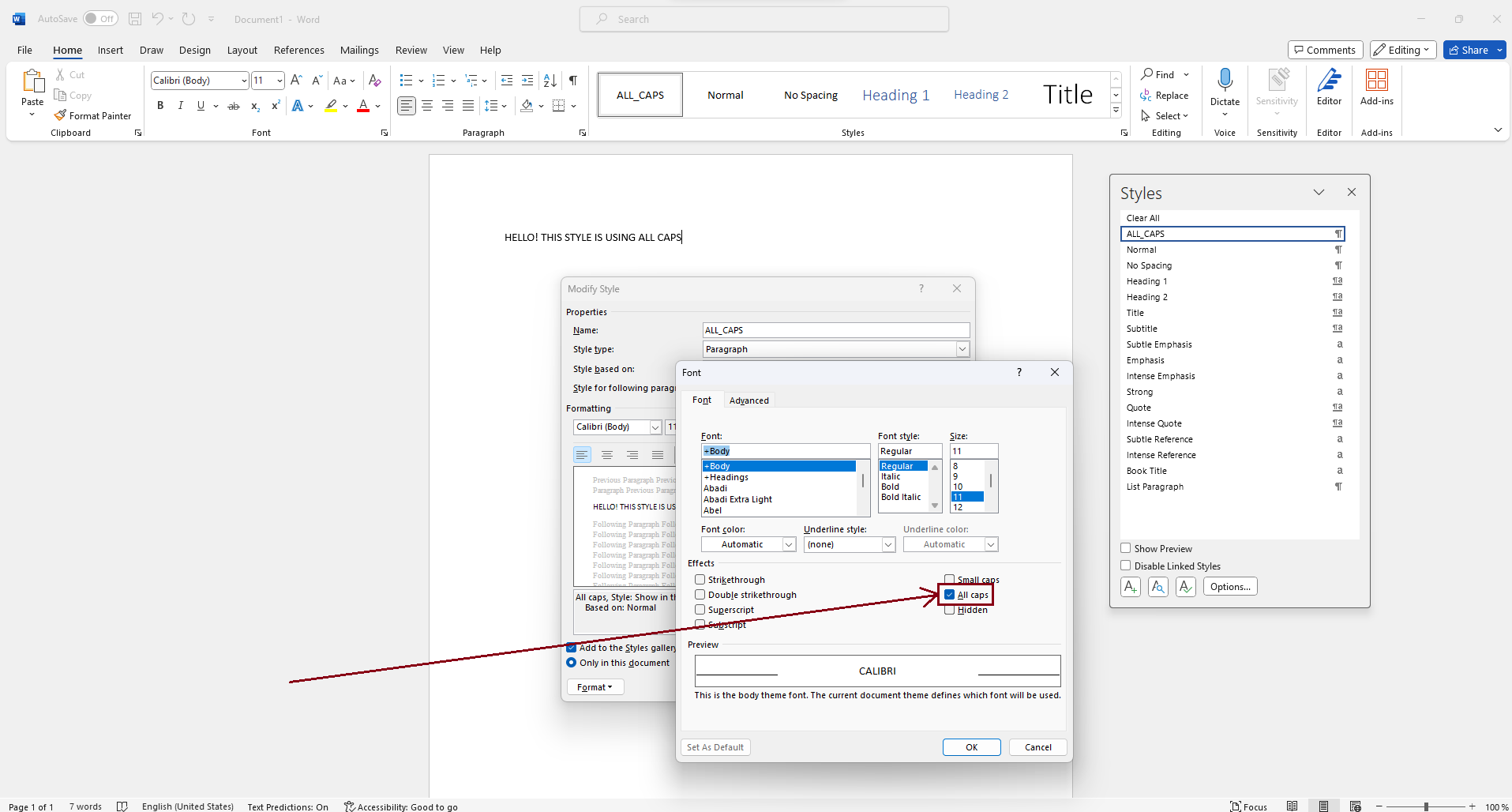 I would like to create a new style with the All Caps Font Effect enabled in my Word document (refer to the attached image).