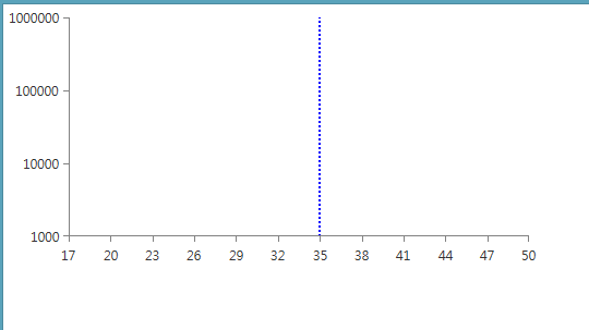 private RadCartesianChart GetChart() { RadCartesianChart cartChart = new RadCartesianChart(); cartChart.HorizontalAxis = new LinearAxis() { Maximum = 50, Minimum = 17, MajorStep = 3 }; cartChart.VerticalAxis = new LogarithmicAxis() { LogarithmBase = 10, Minimum = 1000, Maximum = 1000000 }; LineSeries lineSeries = new LineSeries() { ShowLabels = true }; // lineSeries.CategoryBinding = new PropertyNameDataPointBinding() { PropertyName = "Age" }; lineSeries.CategoryBinding = new GenericDataPointBinding<CordXy, double>() { ValueSelector = value => value.Age }; lineSeries.ValueBinding = new GenericDataPointBinding<CordXy, double>() { ValueSelector = cord => cord.Num }; // lineSeries.ValueBinding = new PropertyNameDataPointBinding() { PropertyName = "Num" }; lineSeries.ItemsSource = CordXy.GetFollicleList(); cartChart.Series.Add(lineSeries); DoubleCollection aray = new DoubleCollection(new double[] {1,1}); cartChart.Annotations.Add( new CartesianCustomLineAnnotation { HorizontalFrom = 35, HorizontalTo = 35, VerticalFrom = 0, VerticalTo = 1000000, Stroke = new SolidColorBrush(Colors.Blue), StrokeThickness = 2, DashArray = aray }); return cartChart; } } public class CordXy { public double Age { get; set; } public double Num { get; set; } public static ObservableCollection<CordXy> GetFollicleList() { var result = new ObservableCollection<CordXy>(); for (int i = 0; i < 33; i++) { var add = new CordXy(); add.Age = i + 18; add.Num = Math.Pow(10, (5.717 - 0.00019 * Math.Pow(add.Age, 2.452))); result.Add(add); } return result; } }As you see, x-axis is linear which shows age of person and y-axis shows calculated value as logarithmic.