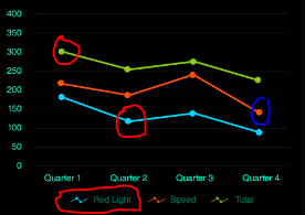 public class SeriesToPaletteColorConverter : IValueConverter{ public object Convert(object value, Type targetType, object parameter, System.Globalization.CultureInfo culture) { var series = (CartesianSeries)value; var chart = (RadCartesianChart)series.Chart; var seriesIndex = chart.Series.IndexOf(series); var entry = chart.Palette.GetEntry(series, seriesIndex); if (entry.HasValue) { return entry.Value.Stroke ?? entry.Value.Fill; } return null; } public object ConvertBack(object value, Type targetType, object parameter, System.Globalization.CultureInfo culture) { throw new NotImplementedException(); }}<telerik:CategoricalSeriesDescriptor ItemsSourcePath="LineDetails"ValuePath="Value"CategoryPath="Key"> <telerik:CategoricalSeriesDescriptor.Style> <Style TargetType="telerik:LineSeries"> <Setter Property="CombineMode" Value="Cluster"/> <Setter Property="ShowLabels" Value="True"/> <Setter Property="PointTemplate"> <Setter.Value> <DataTemplate> <Ellipse Height="5" Width="5" Fill="{Binding Presenter, Converter={StaticResource seriesToPaletteColorConverter}}" /> </DataTemplate> </Setter.Value> </Setter> </Style> </telerik:CategoricalSeriesDescriptor.Style></telerik:CategoricalSeriesDescriptor>2. You can add arrow indicators using the chart's Annotations and LabelDefinition. Please take a look also at the SDK Example about AnnotationTypes.