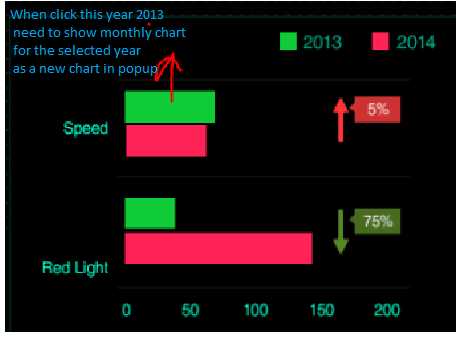 4. We advise you not to do this with popup, but instead position additional chart somewhere around the main one. You can bind it to the selected point of the first chart that will hold the collection with the months data. When a point of the first chart is selected, the second chart will be populated with the collection in the first chart's selected point. This is demonstrated in the second attached project.