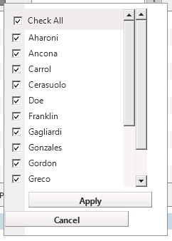 <%@ Assembly Name="$SharePoint.Project.AssemblyFullName$" %><%@ Assembly Name="Microsoft.Web.CommandUI, Version=14.0.0.0, Culture=neutral, PublicKeyToken=71e9bce111e9429c" %><%@ Assembly Name="Telerik.Web.UI, Version=2014.1.225.35, Culture=neutral, PublicKeyToken=121fae78165ba3d4" %><%@ Register Tagprefix="SharePoint" Namespace="Microsoft.SharePoint.WebControls" Assembly="Microsoft.SharePoint, Version=14.0.0.0, Culture=neutral, PublicKeyToken=71e9bce111e9429c" %> <%@ Register Tagprefix="Utilities" Namespace="Microsoft.SharePoint.Utilities" Assembly="Microsoft.SharePoint, Version=14.0.0.0, Culture=neutral, PublicKeyToken=71e9bce111e9429c" %><%@ Register Tagprefix="WebPartPages" Namespace="Microsoft.SharePoint.WebPartPages" Assembly="Microsoft.SharePoint, Version=14.0.0.0, Culture=neutral, PublicKeyToken=71e9bce111e9429c" %><%@ Register Tagprefix="asp" Namespace="System.Web.UI" Assembly="System.Web.Extensions, Version=3.5.0.0, Culture=neutral, PublicKeyToken=31bf3856ad364e35" %><%@ Register TagPrefix="telerik" Namespace="Telerik.Web.UI" Assembly="Telerik.Web.UI, Version=2014.1.225.35, Culture=neutral, PublicKeyToken=121fae78165ba3d4" %><%@ Import Namespace="Microsoft.SharePoint" %><%@ Control Language="C#" AutoEventWireup="true" CodeBehind="RadGridWebPartUserControl.ascx.cs" Inherits="CheckListFiltering.RadGridWebPart.RadGridWebPartUserControl" %><!DOCTYPE html PUBLIC "-//W3C//DTD XHTML 1.0 Transitional//EN" "http://www.w3.org/TR/xhtml1/DTD/xhtml1-transitional.dtd"> <style type="text/css"> .HoverClass { background-color: aqua; } .DefaultClass { background-color: white; } .ClickClass { background-color: yellow; } .RadFilterMenu_CheckList { max-height: 200px !important; height: 200px !important; width: 200px !important; } </style> <script type="text/javascript">// var gridPrototype = Telerik.Web.UI.RadGrid.prototype;// gridPrototype._checkListItemsRequestedHandlerOriginal = gridPrototype._checkListItemsRequestedHandler;// gridPrototype._checkListItemsRequestedHandler = function () {// this._checkListItemsRequestedHandlerOriginal(); // call the origianl method// var filterCheckList = $find(this._filterCheckListClientID); // get the check list// var column = this._checkListFilterActiveColumn.get_uniqueName(); // get the active column// filterCheckList.get_items().getItem(0).check(); // check the first item for example// } function RowCreated(sender, eventArgs) { var dataItem = eventArgs.get_gridDataItem(); for (var i = 0; i < dataItem.get_element().cells.length; i++) { dataItem._element.cells[i].onmouseover = function () { this.className = "HoverClass"; } dataItem.get_element().cells[i].onmouseout = function () { var cssName = this.selected ? "ClickClass" : "DefaultClass"; this.className = cssName; return; } dataItem.get_element().cells[i].onclick = function (event) { this.selected = this.selected == true ? false : true; var cssName = this.selected ? "ClickClass" : "DefaultClass"; this.className = cssName; return; } } } </script> <telerik:RadFormDecorator ID="QsfFromDecorator" runat="server" DecoratedControls="All" EnableRoundedCorners="false" /> <telerik:RadGrid runat="server" ID="RadGrid1" AllowFilteringByColumn="true" FilterType="CheckList" OnNeedDataSource="RadGrid1_NeedDataSource" OnFilterCheckListItemsRequested="RadGrid1_NeedCheckListItems"> <MasterTableView AutoGenerateColumns="False" > <Columns /> </MasterTableView> <ClientSettings> <ClientEvents OnRowCreated="RowCreated" /> </ClientSettings> </telerik:RadGrid>In the code behind Grid's columns are created in the "onLoad" function, while in the "OnNeedDataSource" handler the Grid must be filtered (if client has applied a checklistfilter) and associated to RadGrid1.