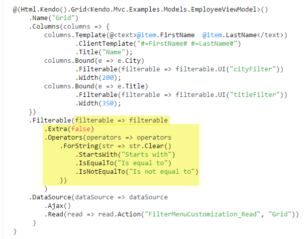 @(Html.Kendo().Grid<Kendo.Mvc.Examples.Models.EmployeeViewModel>() .Name("Grid") .Columns(columns => { columns.Template(@<text>@item.FirstName @item.LastName</text>) .ClientTemplate("#=FirstName# #=LastName#") .Title("Name"); columns.Bound(e => e.City) .Filterable(filterable => filterable.UI("cityFilter")) .Width(200); columns.Bound(e => e.Title) .Filterable(filterable => filterable.UI("titleFilter")) .Width(350); }) .Filterable(filterable => filterable .Extra(false) .Operators(operators => operators .ForString(str => str.Clear() .StartsWith("Starts with") .IsEqualTo("Is equal to") .IsNotEqualTo("Is not equal to") )) ) .DataSource(dataSource => dataSource .Ajax() .Read(read => read.Action("FilterMenuCustomization_Read", "Grid")) ))