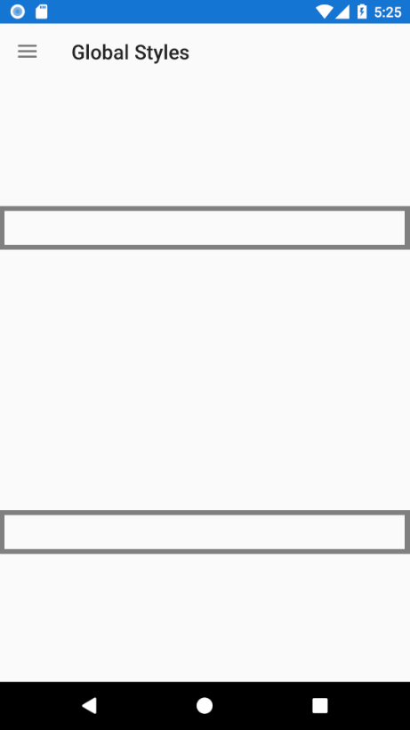 <OnPlatform x:Key="EntryPadding" x:TypeArguments="Thickness"> <On Platform="iOS" Value="10,10,0,20" /> <On Platform="Android,UWP" Value="10,10,0,10" /></OnPlatform> <input:BorderStyle x:Key="EntryBorderStyle" CornerRadius="0" BorderColor="#808080" BorderThickness="5"/> <Style TargetType="input:RadEntry"> <Setter Property="Padding" Value="{StaticResource EntryPadding}" /> <Setter Property="BorderStyle" Value="{StaticResource EntryBorderStyle}"/></Style>Here is the result at runtime on Android with two RadEntry controls on a nested page: