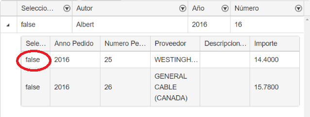 01.public class SeleccionarPedidosModel02.{03. public IEnumerable<ExpedienteRow> ExpedienteRows { get; set; }04.}05. 06.public class ExpedienteRow07.{08. public bool Seleccionado { get; set; } // binded to the first column (checkbox)09. public Guid IdExpediente { get; set; }10. public string Autor { get; set; }11. public int NumeroExpediente { get; set; }12. public int AnnoExpediente { get; set; }13. public IEnumerable<PedidoRow> Pedidos { get; set; } // Detail grid content14.}15. 16.public class PedidoRow17.{18. public Guid IdPedido { get; set; }19. public bool Seleccionado { get; set; } // binded to the first column (checkbox)20. public int NumeroPedido { get; set; }21. public int AnnoPedido { get; set; }22. public string Proveedor { get; set; }23. public string DescripcionMaterial { get; set; }24. public decimal Importe { get; set; }25.}