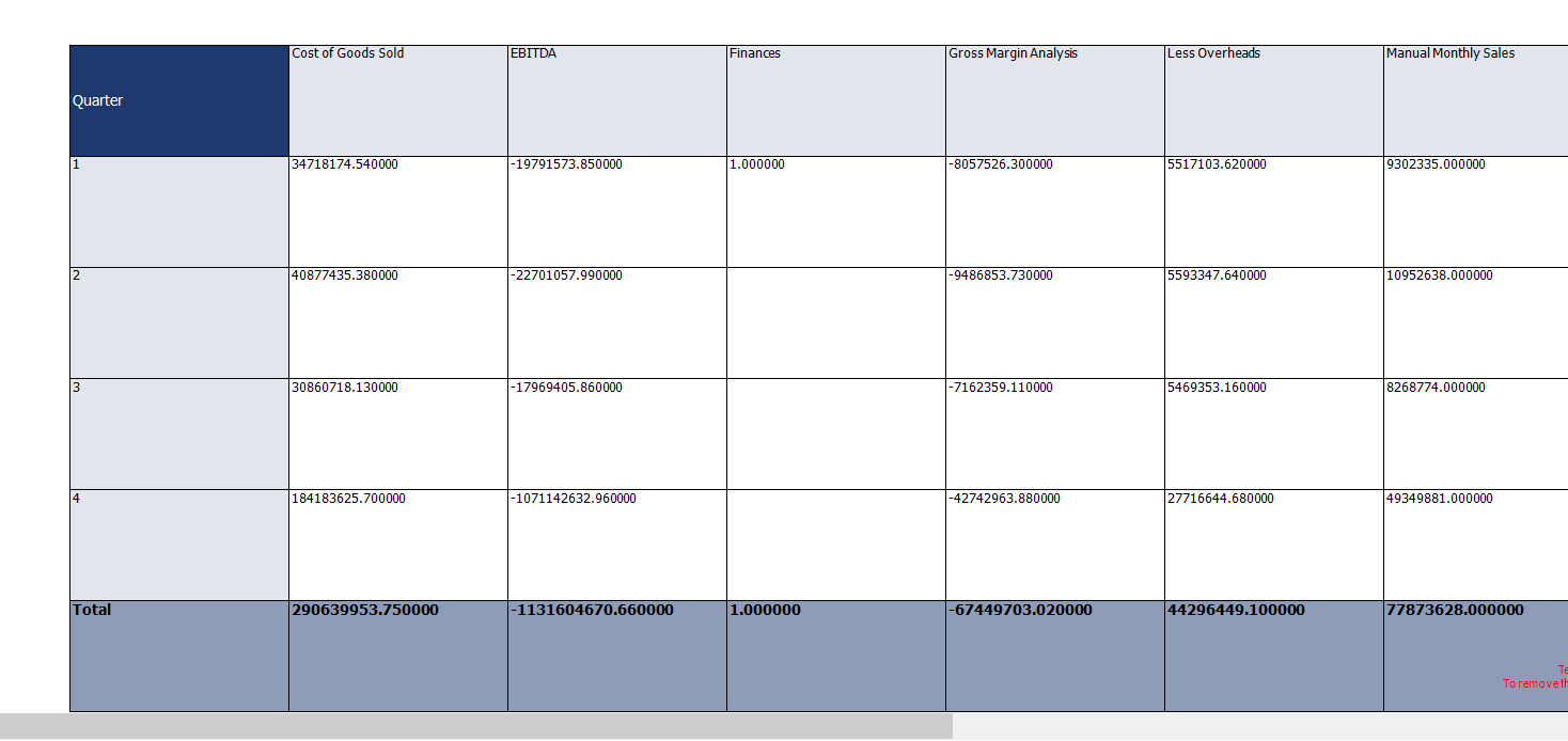 I had these KPI that I aggregated LIKE EBTIDA AND COGS that I am getting my Grouping my quarters at row level and at column level by my Subsection columns.