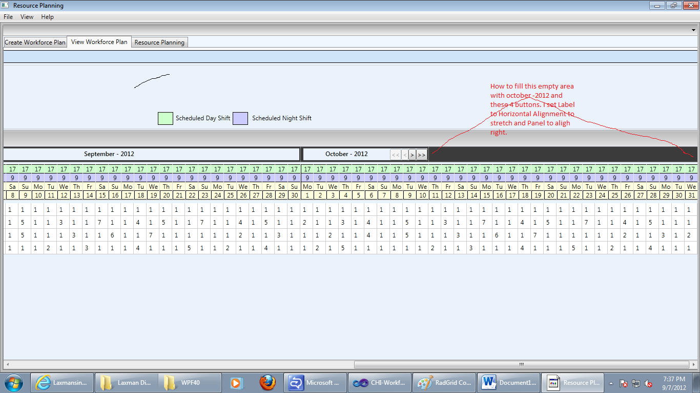 But my issues is when I use 2012 Q2 version of telerik controls the Label controls and Panel with 4 buttons in the Colum Group Header does not cover all the columns and leave black color space at right side columns. screen shot has been attached with this thread. Please have a look and provide solution.