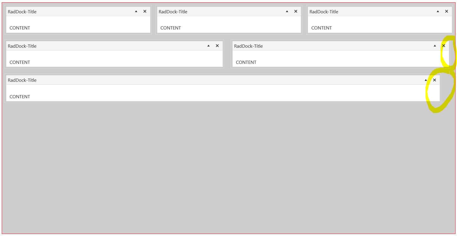 001.<style type="text/css">002. .td33003. {004. width: 33%;005. height: 98%;006. vertical-align:top;007. }008. .td100009. {010. width: 100%;011. height: 98%;012. vertical-align:top;013. }014. .td50015. {016. width: 50%;017. height: 98%;018. vertical-align:top;019. }020. div#main021. {022. position: relative;023. height: 800px;024. width: 100%;025. background-color: #ccc;026. overflow-y: auto;027. border: 1px solid red;028. }029. </style>030. <telerik:RadDockLayout ID="RadDockLayout1" runat="server">031. <div id="main">032. <table style="table-layout: fixed; width: 100%;">033. <tr>034. <td class="td33">035. <telerik:RadDockZone ID="RadDockZone1" runat="server" Width="96%" MinHeight="50px"036. Height="95%">037. <telerik:RadDock ID="RadDock1" runat="server" Width="300px" Title="RadDock-Title">038. <ContentTemplate>039. <br />040. CONTENT041. <br />042. </ContentTemplate>043. </telerik:RadDock>044. </telerik:RadDockZone>045. </td>046. <td class="td33">047. <telerik:RadDockZone ID="RadDockZone2" runat="server" Width="96%" MinHeight="50px"048. Height="95%">049. <telerik:RadDock ID="RadDock2" runat="server" Width="300px" Title="RadDock-Title">050. <ContentTemplate>051. <br />052. CONTENT053. <br />054. </ContentTemplate>055. </telerik:RadDock>056. </telerik:RadDockZone>057. </td>058. <td class="td33">059. <telerik:RadDockZone ID="RadDockZone3" runat="server" Width="96%" MinHeight="50px"060. Height="95%">061. <telerik:RadDock ID="RadDock3" runat="server" Width="300px" Title="RadDock-Title">062. <ContentTemplate>063. <br />064. CONTENT065. <br />066. </ContentTemplate>067. </telerik:RadDock>068. </telerik:RadDockZone>069. </td>070. </tr>071. </table>072. 073. <table style="table-layout: fixed; width: 100%;">074. <tr>075. <td class="td50">076. <telerik:RadDockZone ID="RadDockZone5" runat="server" Width="96%" MinHeight="50px"077. Height="95%">078. <telerik:RadDock ID="RadDock5" runat="server" Width="300px" Title="RadDock-Title">079. <ContentTemplate>080. <br />081. CONTENT082. <br />083. </ContentTemplate>084. </telerik:RadDock>085. </telerik:RadDockZone>086. </td>087. <td class="td50">088. <telerik:RadDockZone ID="RadDockZone6" runat="server" Width="96%" MinHeight="50px"089. Height="95%">090. <telerik:RadDock ID="RadDock6" runat="server" Width="300px" Title="RadDock-Title">091. <ContentTemplate>092. <br />093. CONTENT094. <br />095. </ContentTemplate>096. </telerik:RadDock>097. </telerik:RadDockZone>098. </td>099. </tr>100. </table>101. 102. 103. <table style="table-layout: fixed; width: 100%;">104. <tr>105. <td class="td100">106. <telerik:RadDockZone ID="RadDockZone4" runat="server" Width="96%" MinHeight="50px"107. Height="95%">108. <telerik:RadDock ID="RadDock4" runat="server" Width="300px" Title="RadDock-Title">109. <ContentTemplate>110. <br />111. CONTENT112. <br />113. </ContentTemplate>114. </telerik:RadDock>115. </telerik:RadDockZone>116. </td>117. </tr>118. </table>119. </div>120. </telerik:RadDockLayout>