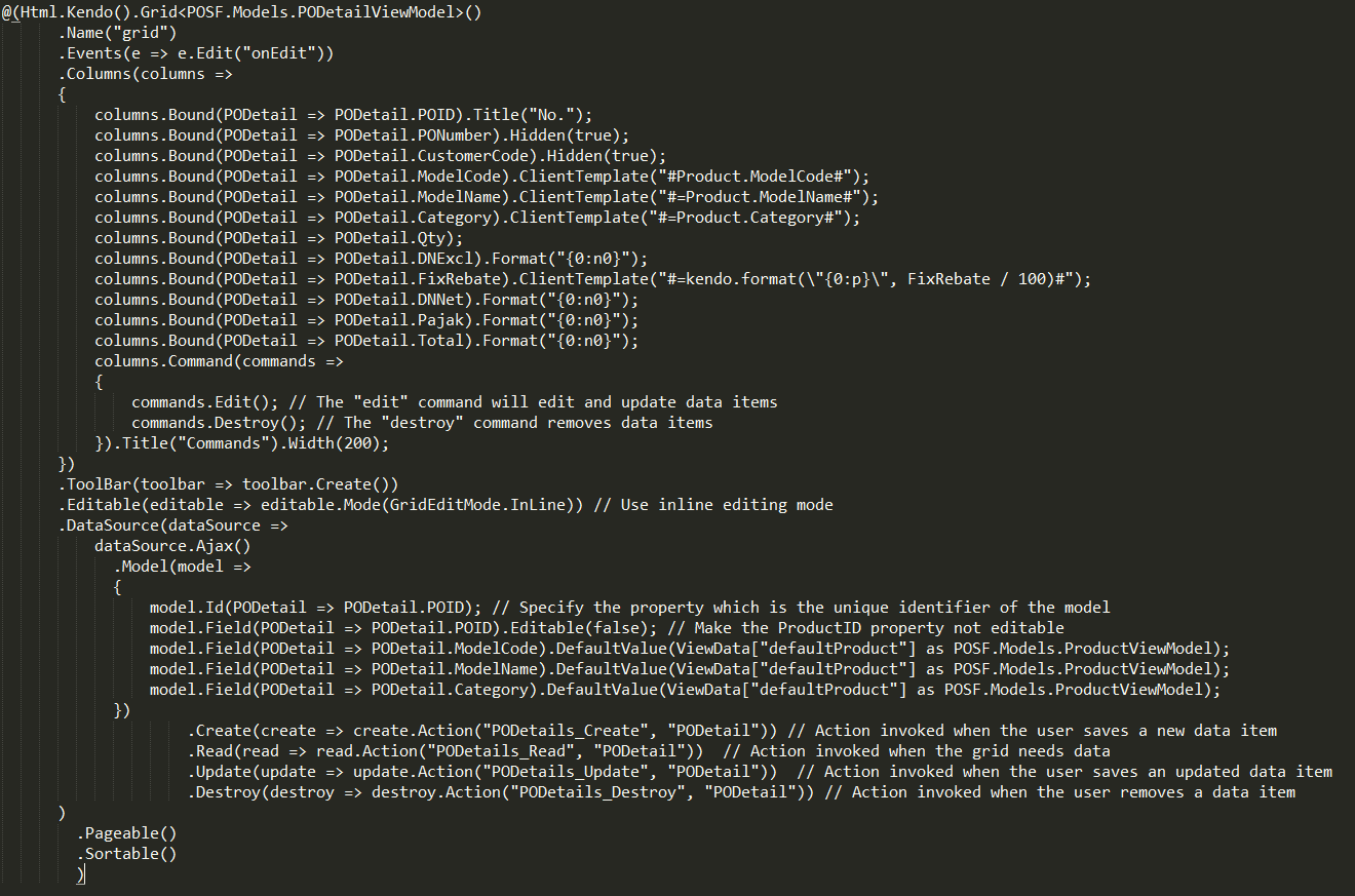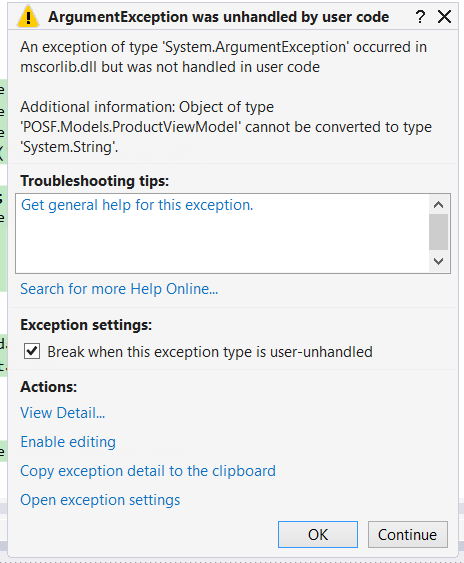 I've tried several times to create a dropdown list inside a grid by following this link. But I still cannot create a dropdown list inside a grid. It always shows error when I run the program. It says ""An exception of type 'System.ArgumentException' occurred in mscorlib.dll but was not handled in user code. Additional information: Object of type 'POSF.Models.ProductViewModel' cannot be converted to type 'System.String'." I don't know how to do, I have done all like the link said.