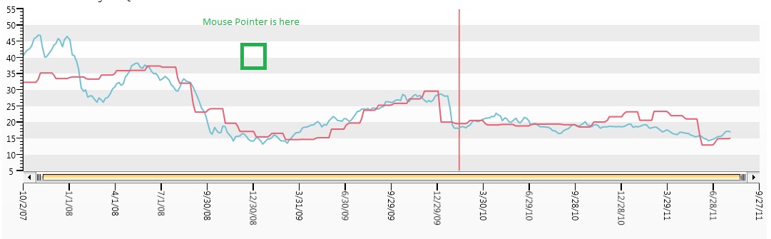 private void PlotArea_MouseMove(object sender, System.Windows.Input.MouseEventArgs e) { var plotAreaPanel = sender as ClipPanel; var position = e.GetPosition(plotAreaPanel); var x = RadChart1.DefaultView.ChartArea.AxisX.ConvertPhysicalUnitsToData(position.X); var y = RadChart1.DefaultView.ChartArea.AxisY.ConvertPhysicalUnitsToData(position.Y); (this.DataContext as ViewModel).X = x; (this.DataContext as ViewModel).Y = y; DataSeries series = (DataSeries)(this.RadChart1.DefaultView.ChartArea.Items[0]); var dataPoint = series.Where(myX => myX == series[(int)x]).SingleOrDefault(); (this.DataContext as ViewModel).XCat = DateTime.Parse(dataPoint.XCategory); }You may find a sample project where the approach is demonstrated.