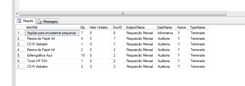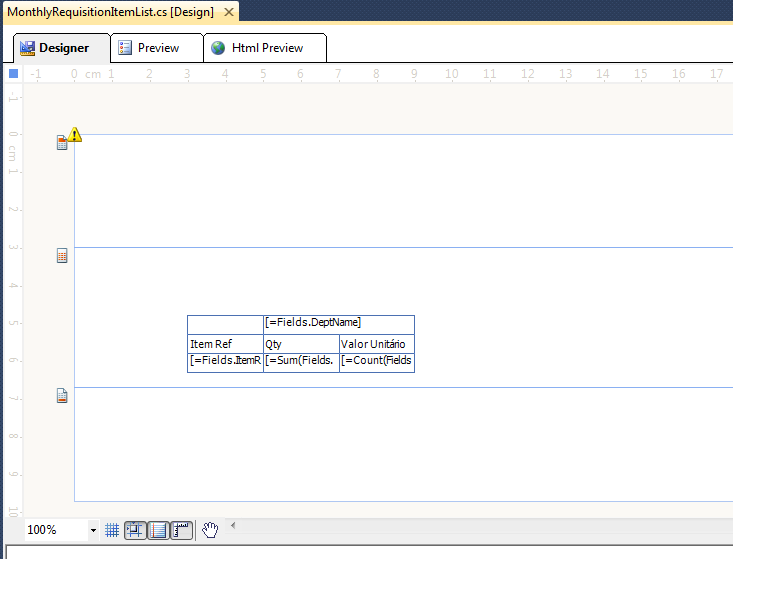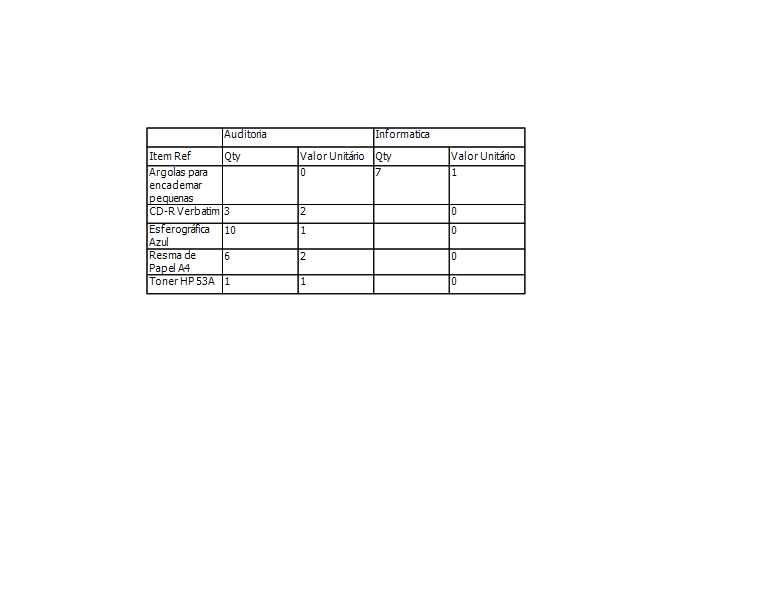 -A department "group" with a quantity (Qty) and unit price (Valor Unitario) columns, with a total of [Valor Unitário]*[qty] by department,