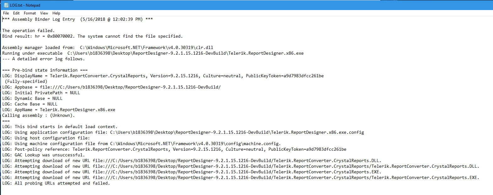 I have also looked at the FUSLUGVW.exe Assembly Binding Log viewer, and have attached the error.