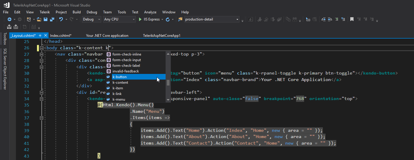 <link rel="stylesheet" href="https://kendo.cdn.telerik.com/2019.2.619/styles/kendo.bootstrap-v4.min.css" asp-fallback-href="~/lib/kendo-ui/styles/kendo.bootstrap-v4.css" asp-fallback-test-class="k-theme-test-class" asp-fallback-test-property="opacity" asp-fallback-test-value="0" /> <link rel="stylesheet" href="~/css/styles.css" /></environment>This is how the environment tags should look like in your project based on the paths to the files I see from your code snippet.