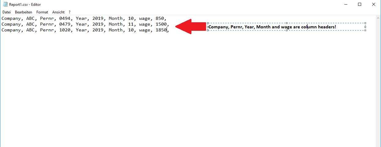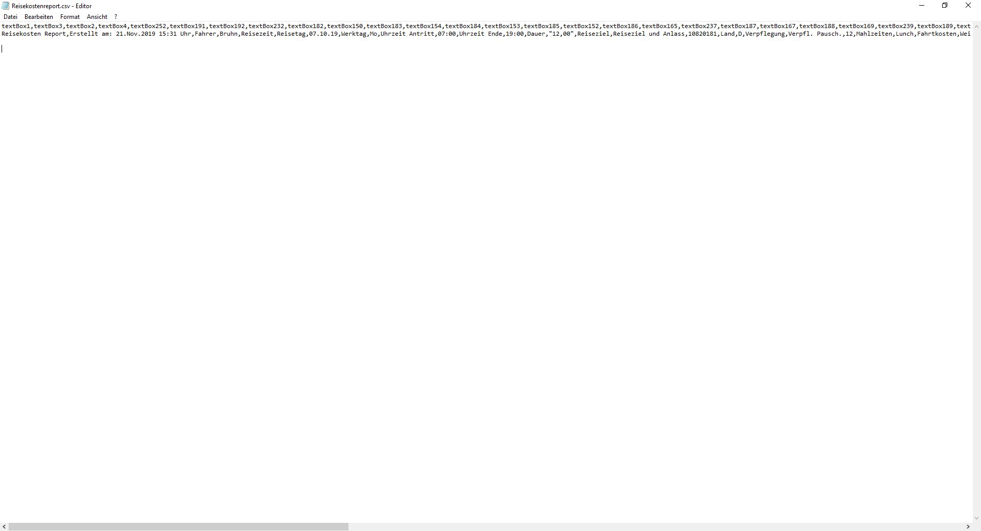I also have some textboxes with content Format("created on: {0:dd/MMM/yyyy HH:mm} ", Now()) and "Reisekosten Report" in the report header, which should not appear in the csv file.