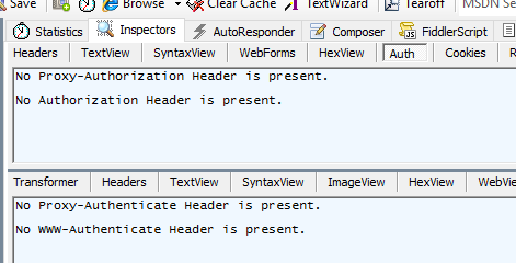 The authorization window says no authorization header is being sent, and when I look at headers sure enough, no auth headers.