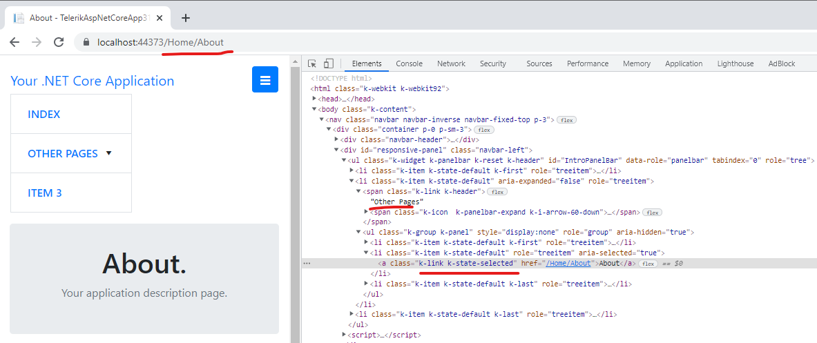 )Each item in the PanelBar is connected to an action. When loading "/Home/Index" the selected item in the PanelBar after loading the page is the first item "Home". It works like expected.