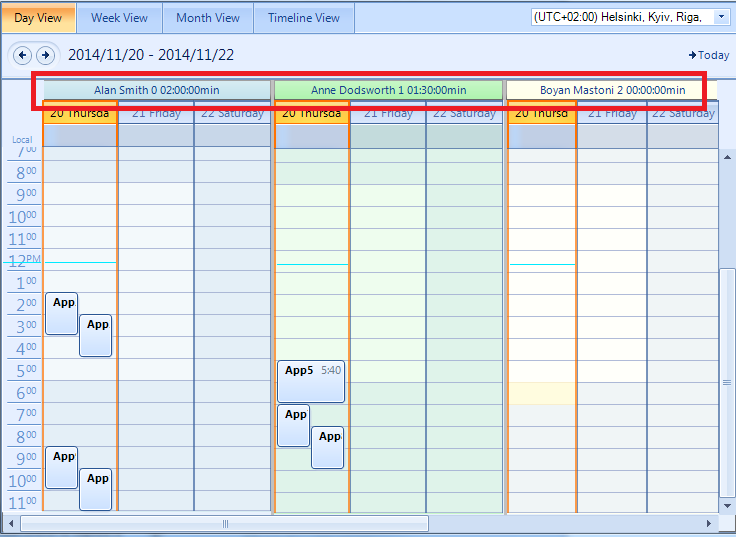 Sub New() InitializeComponent() Dim colors() As Color = {Color.LightBlue, Color.LightGreen, Color.LightYellow, _ Color.Red, Color.Orange, Color.Pink, Color.Purple, Color.Peru, Color.PowderBlue} Dim names() As String = {"Alan Smith", "Anne Dodsworth", "Boyan Mastoni", "Richard Duncan", "Maria Shnaider"} For i As Integer = 0 To names.Length - 1 Dim resource As New Telerik.WinControls.UI.Resource() resource.Id = New EventId(i) resource.Name = names(i) resource.Color = colors(i) Me.RadScheduler1.Resources.Add(resource) Next i Dim rand As New Random For index = 1 To 10 Dim app As New Appointment(DateTime.Now.AddHours(index), TimeSpan.FromMinutes(30), "App" & index) app.ResourceId = Me.RadScheduler1.Resources(rand.Next(0, Me.RadScheduler1.Resources.Count)).Id Me.RadScheduler1.Appointments.Add(app) Next AddHandler Me.RadScheduler1.CellFormatting, AddressOf RadScheduler1_CellFormatting Me.RadScheduler1.ActiveView.ResourcesPerView = 3 Me.RadScheduler1.GroupType = GroupType.ResourceEnd SubPrivate Sub RadScheduler1_CellFormatting(sender As Object, e As SchedulerCellEventArgs) If e.CellElement.Class = "ResourceCell" Then Dim resourceByText As Resource = GetResource(e.CellElement.Text) If e.CellElement.Tag = Nothing Or resourceByText IsNot Nothing Then e.CellElement.Tag = e.CellElement.Text End If If e.CellElement.Tag IsNot Nothing Then Dim resource As Resource = GetResource(e.CellElement.Tag.ToString()) If resource IsNot Nothing Then e.CellElement.Text = resource.Name & " " & resource.Id.KeyValue & " " & _ GetAppointmentsDuration(resource).ToString() & "min" End If End If End IfEnd SubPrivate Function GetResource(resourceName As String) As Resource For Each r As Resource In Me.RadScheduler1.Resources If r.Name = resourceName Then Return r End If Next Return NothingEnd FunctionPrivate Function GetAppointmentsDuration(resource As Resource) As Object Dim duration As New TimeSpan For Each a As Appointment In Me.RadScheduler1.Appointments If a.ResourceId.KeyValue = resource.Id.KeyValue Then duration = duration.Add(a.Duration) End If Next Return durationEnd FunctionIt is important to subscribe to the CellFormatting event after populating the scheduler with appointments and before changing the GroupType to GroupType.Resource in order to get the correct duration.