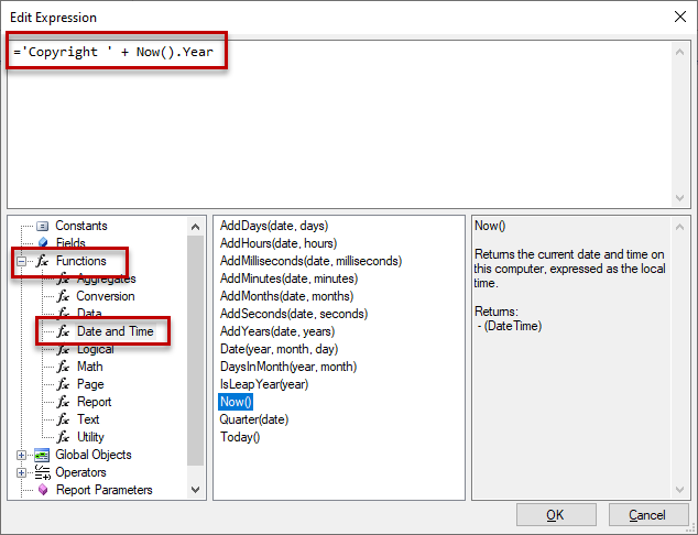 We would like the year to automatically update every year and not have to go back in to the reports to manually change the year. Can someone please help me with this? I have an expression set up right now that just says = 'Copyright 2021'. Thanks!