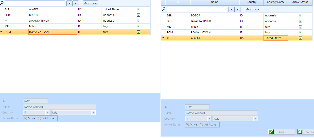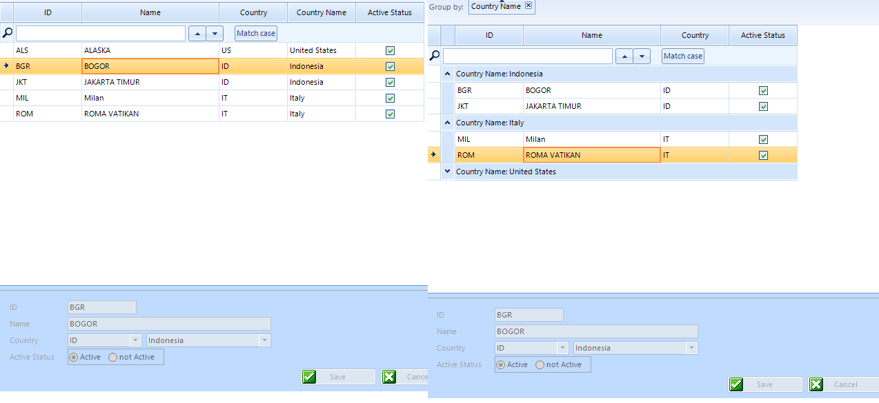 2. when I click the row in index 1 (ID = BGR and name = BOGOR), buf after grouping the column country name, when I click the value (ID = ROM and name = ROMA VATIKAN), the value is still (ID = BGR and name = BOGOR) not (ID = ROM and name = ROM VATIKAN) cause it refer into index = 1... how to get value ID = "ROM" in index for,, look for the attachment image (grid after grouping.png)