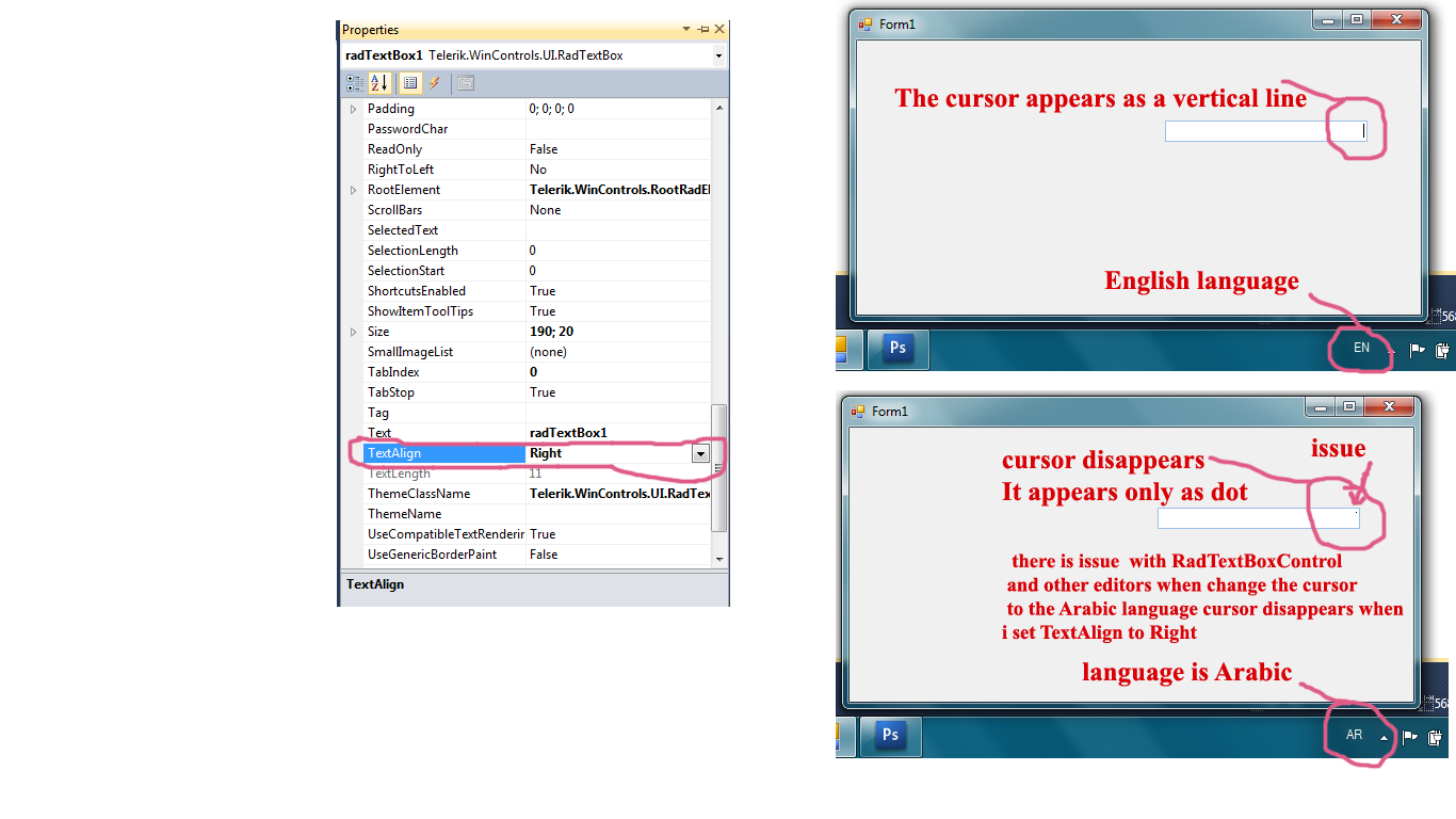 i have problem with RadTextBoxControl and other editors I change the cursor to the Arabic language cursor disappears