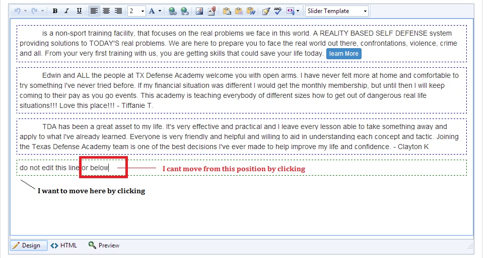 I have searched and search and have not found the answer to this. When I have html elements <p></p> or <div></div> and I want to move out of the current tag and start a new line I am unable to do so by click to the next line. If I click enter it moves me to the next line within the same tag. How can I move the cursor by clicking to a new line outside the current element my cursor was in? I have attached an image in case that helps.